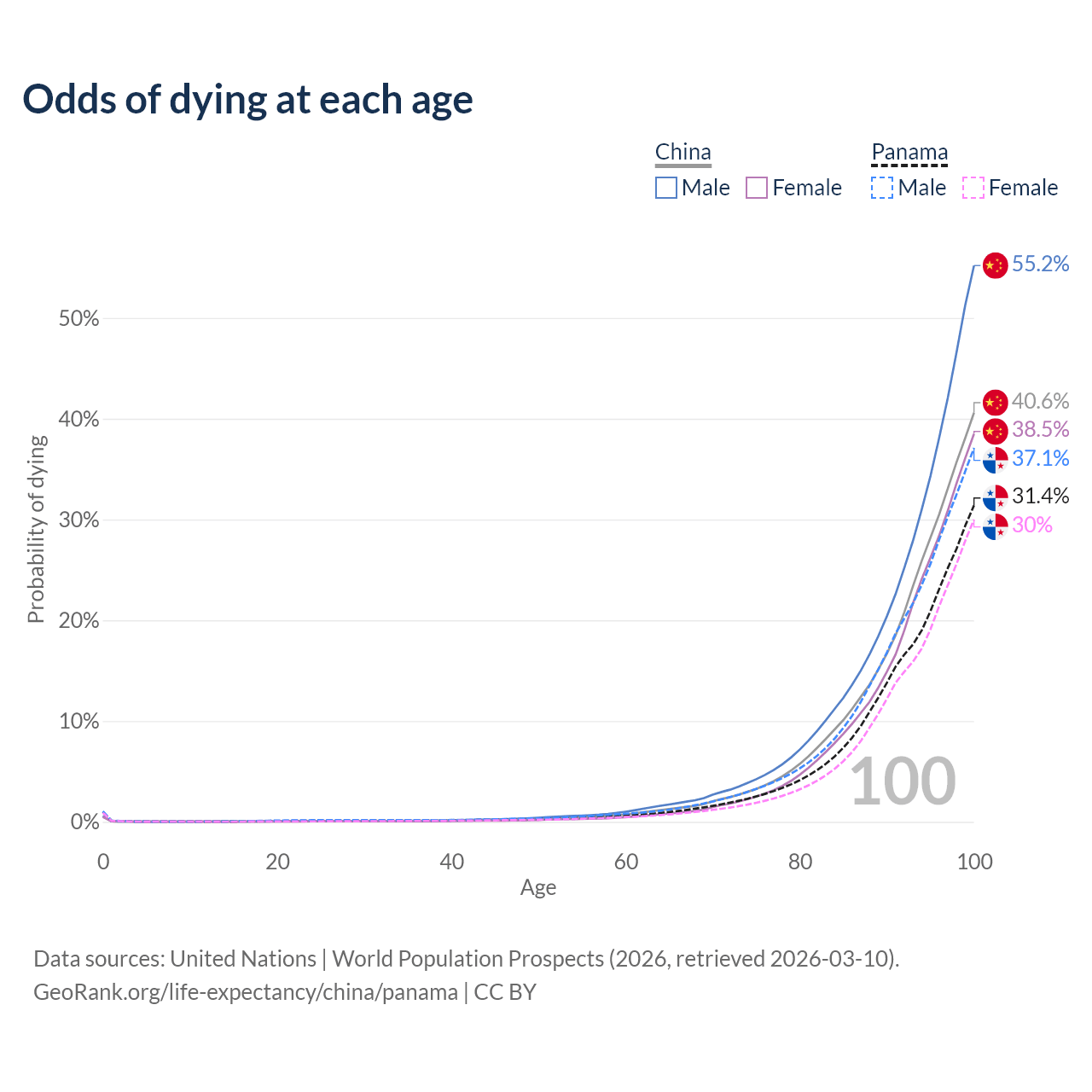This life expectancy calculator shows the odds of living to 100, 95, 90, and below based on current age for both males and females in China and Panama, along with mean and median age of death. The calculations are based on the 2026 life tables (actuarial tables) from the UN World Population Prospects.