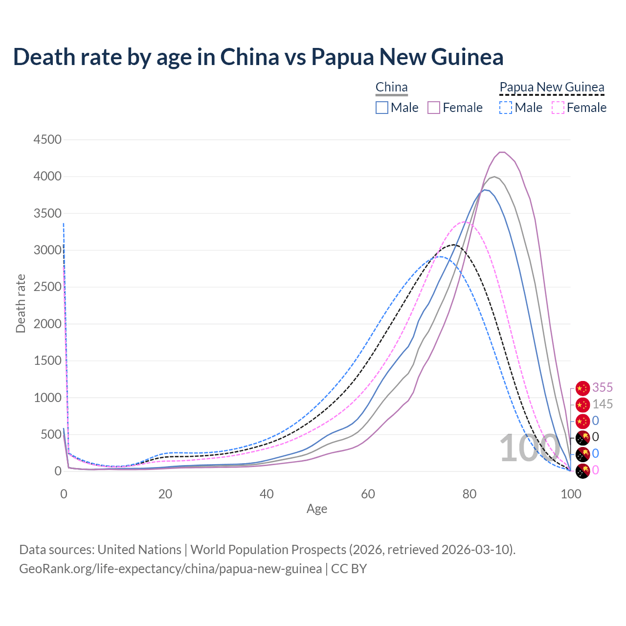 In China, the most common age of death is 85, compared to 0 in Papua New Guinea. The median age of death is 82.3 in China and 71.7 in Papua New Guinea, meaning only half of each cohort is expected to live past that age.
