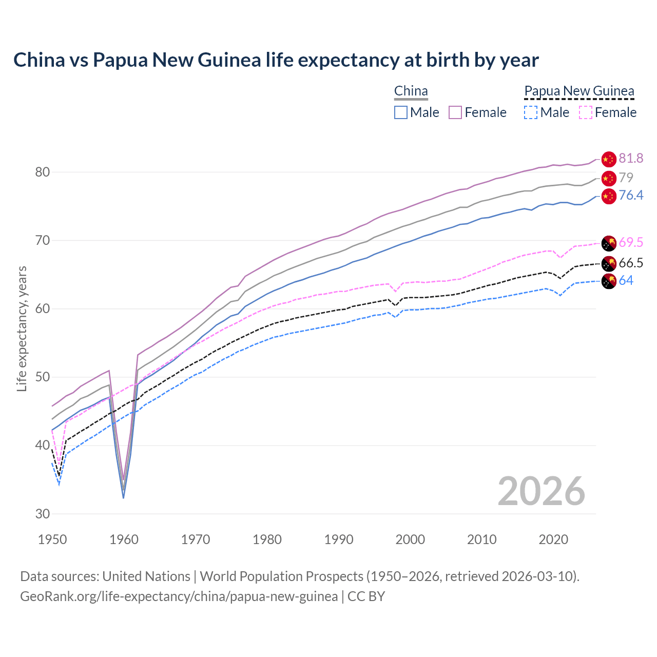 The average life expectancy at birth is 79 years in China vs 66.5 in Papua New Guinea. China is ranked 52/197 by life expectancy, and Papua New Guinea is 166/197. In China, the life expectancy is 76.4 years for males and 81.8 years for females. In Papua New Guinea, it's 64 years for males and 69.5 years for females.