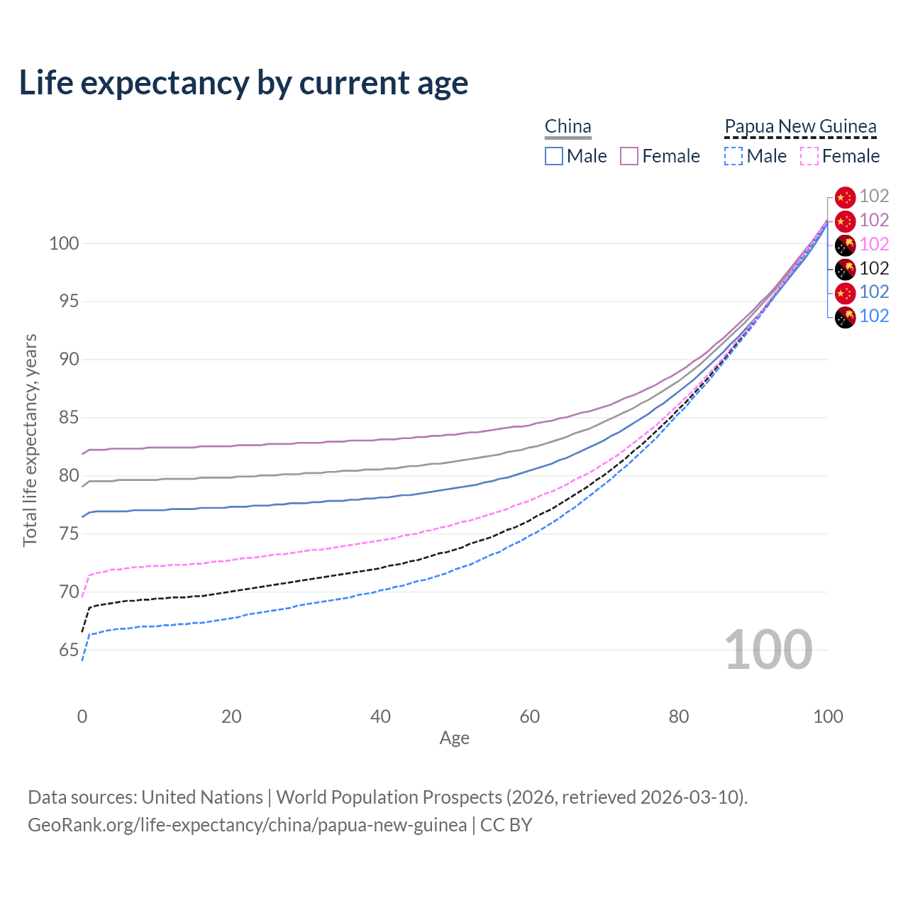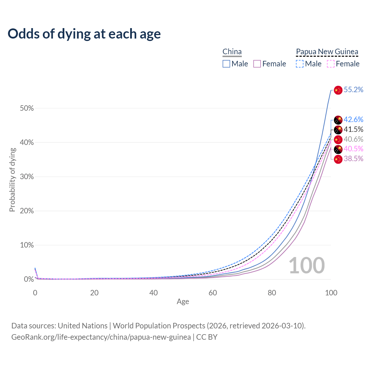 This life expectancy calculator shows the odds of living to 100, 95, 90, and below based on current age for both males and females in China and Papua New Guinea, along with mean and median age of death. The calculations are based on the 2026 life tables (actuarial tables) from the UN World Population Prospects.