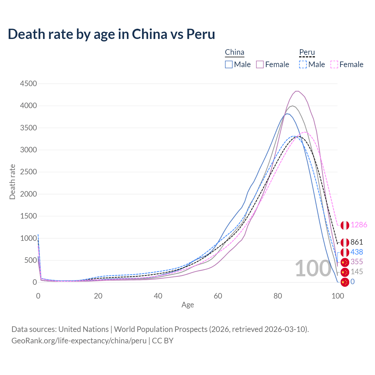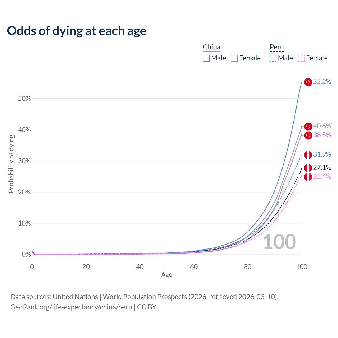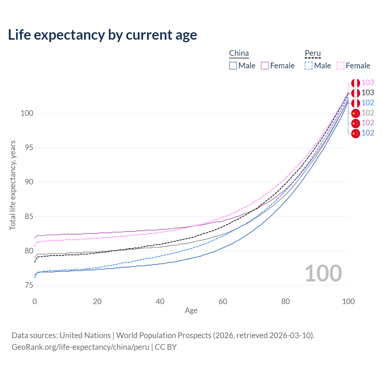 This life expectancy calculator shows the odds of living to 100, 95, 90, and below based on current age for both males and females in China and Peru, along with mean and median age of death. The calculations are based on the 2026 life tables (actuarial tables) from the UN World Population Prospects.