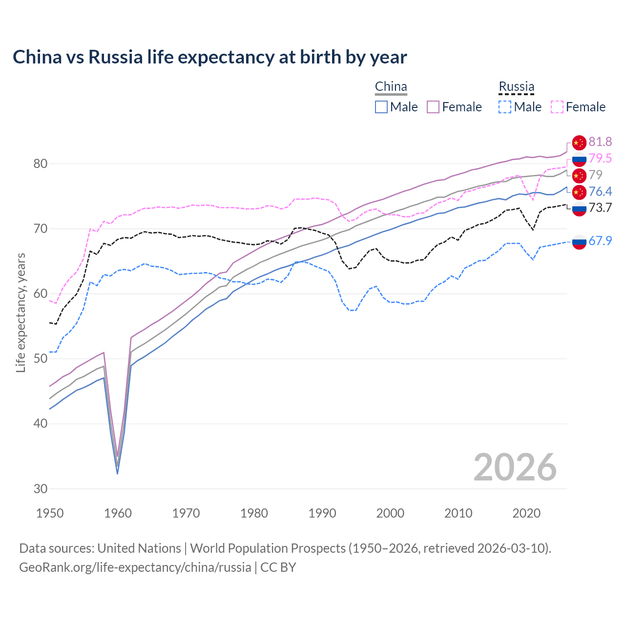 The average life expectancy at birth is 79 years in China vs 73.7 in Russia. China is ranked 52/197 by life expectancy, and Russia is 107/197. In China, the life expectancy is 76.4 years for males and 81.8 years for females. In Russia, it's 67.9 years for males and 79.5 years for females.