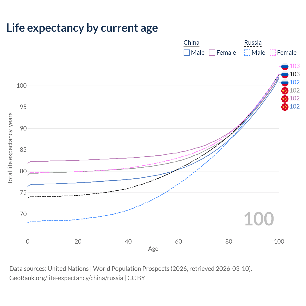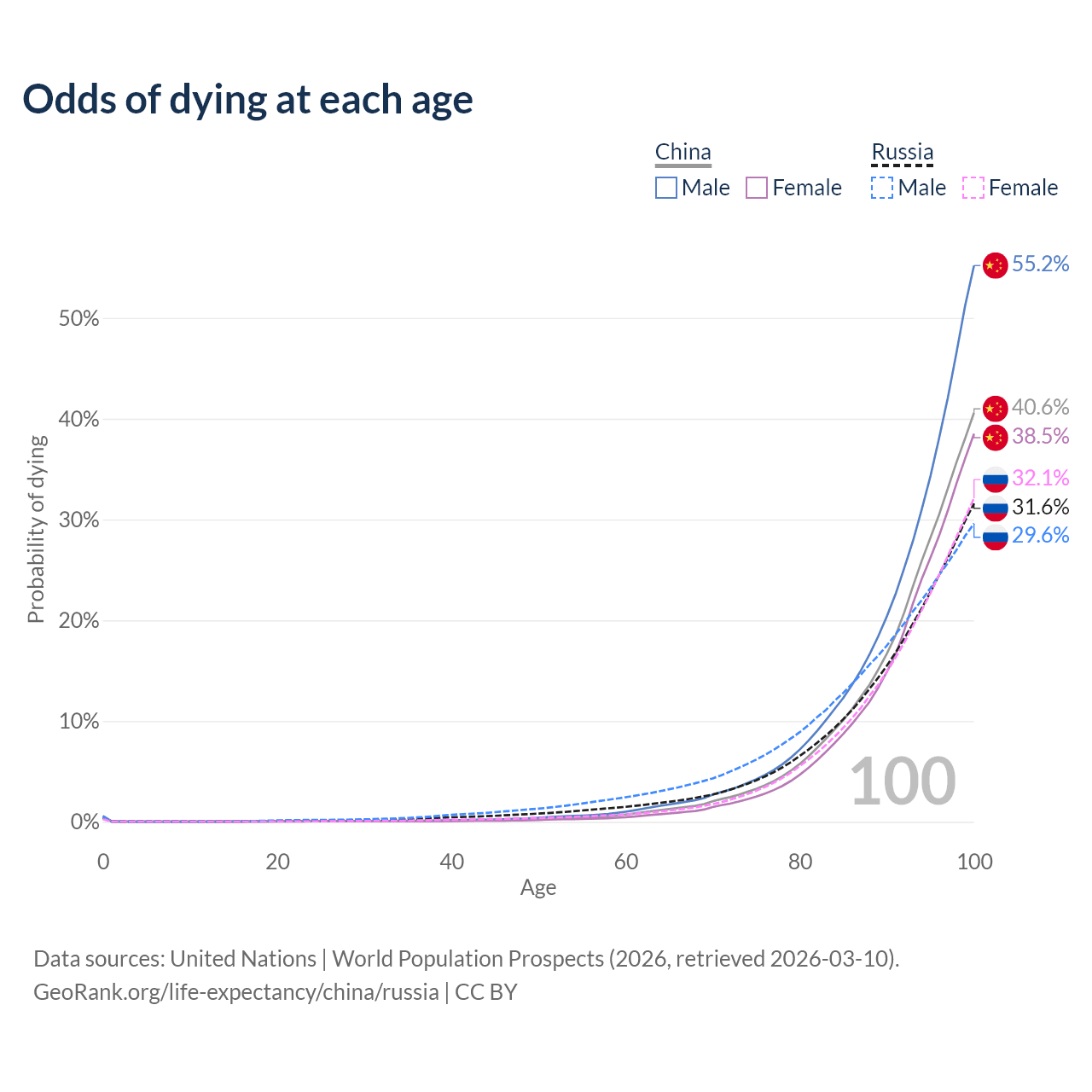 This life expectancy calculator shows the odds of living to 100, 95, 90, and below based on current age for both males and females in China and Russia, along with mean and median age of death. The calculations are based on the 2026 life tables (actuarial tables) from the UN World Population Prospects.