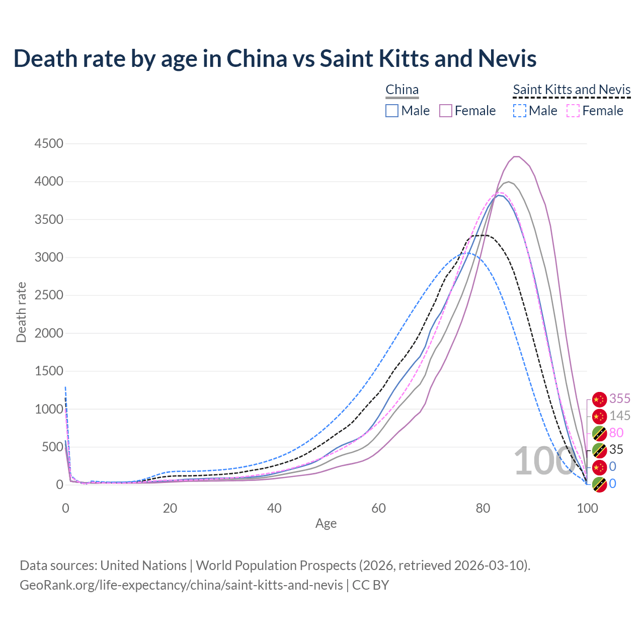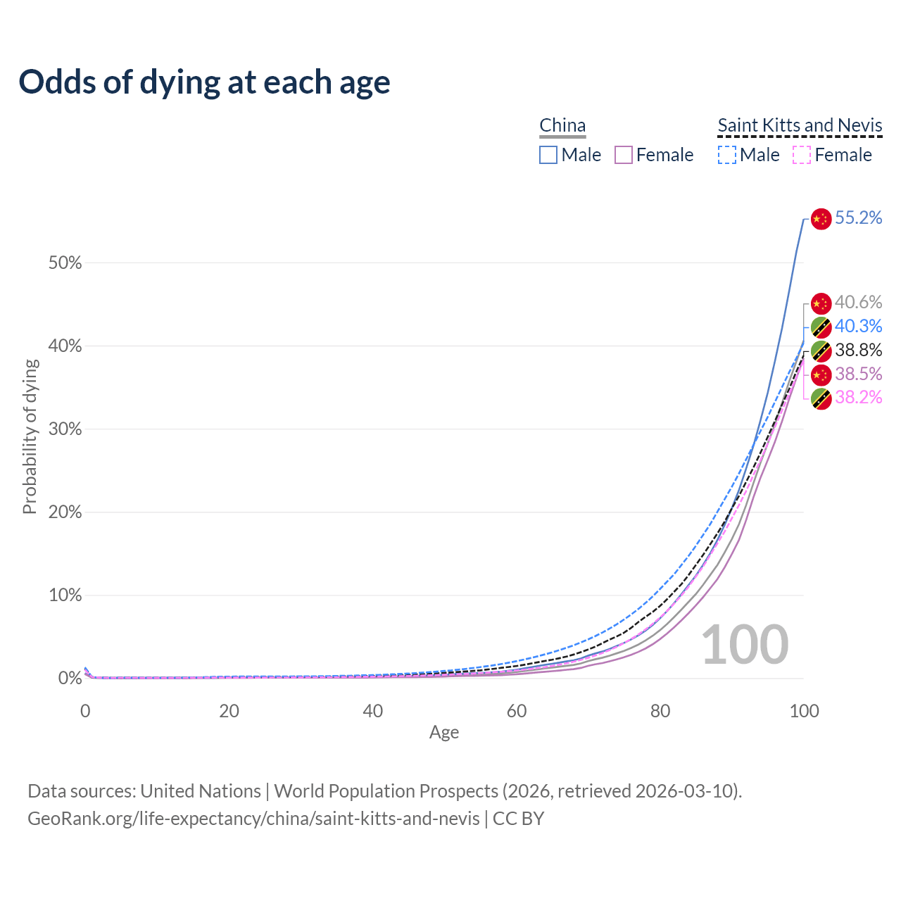 This life expectancy calculator shows the odds of living to 100, 95, 90, and below based on current age for both males and females in China and Saint Kitts and Nevis, along with mean and median age of death. The calculations are based on the 2026 life tables (actuarial tables) from the UN World Population Prospects.