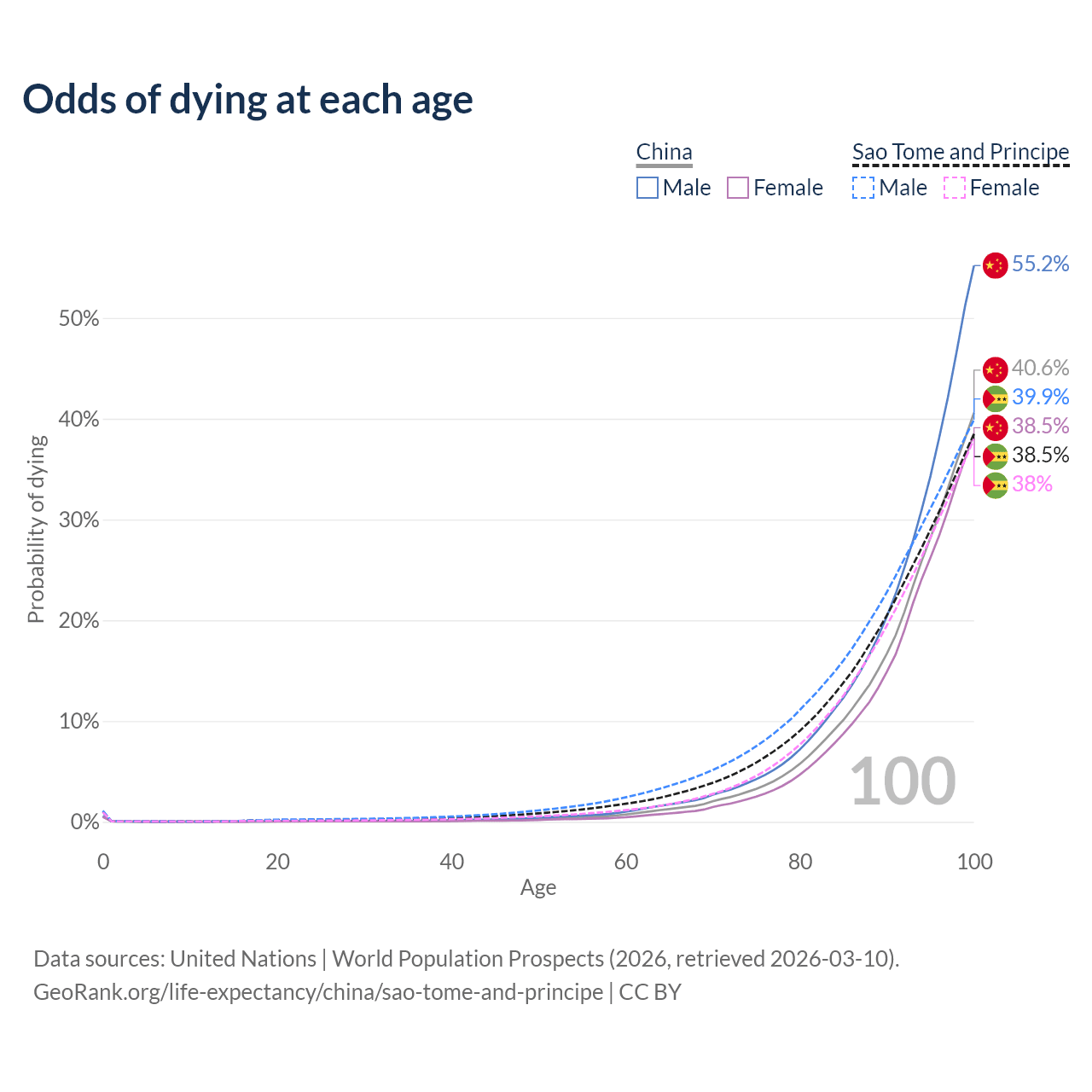This life expectancy calculator shows the odds of living to 100, 95, 90, and below based on current age for both males and females in China and Sao Tome and Principe, along with mean and median age of death. The calculations are based on the 2026 life tables (actuarial tables) from the UN World Population Prospects.