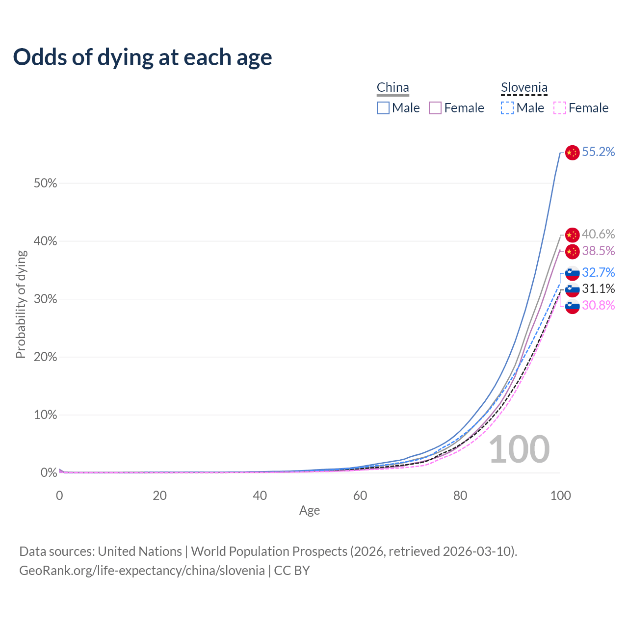 This life expectancy calculator shows the odds of living to 100, 95, 90, and below based on current age for both males and females in China and Slovenia, along with mean and median age of death. The calculations are based on the 2026 life tables (actuarial tables) from the UN World Population Prospects.