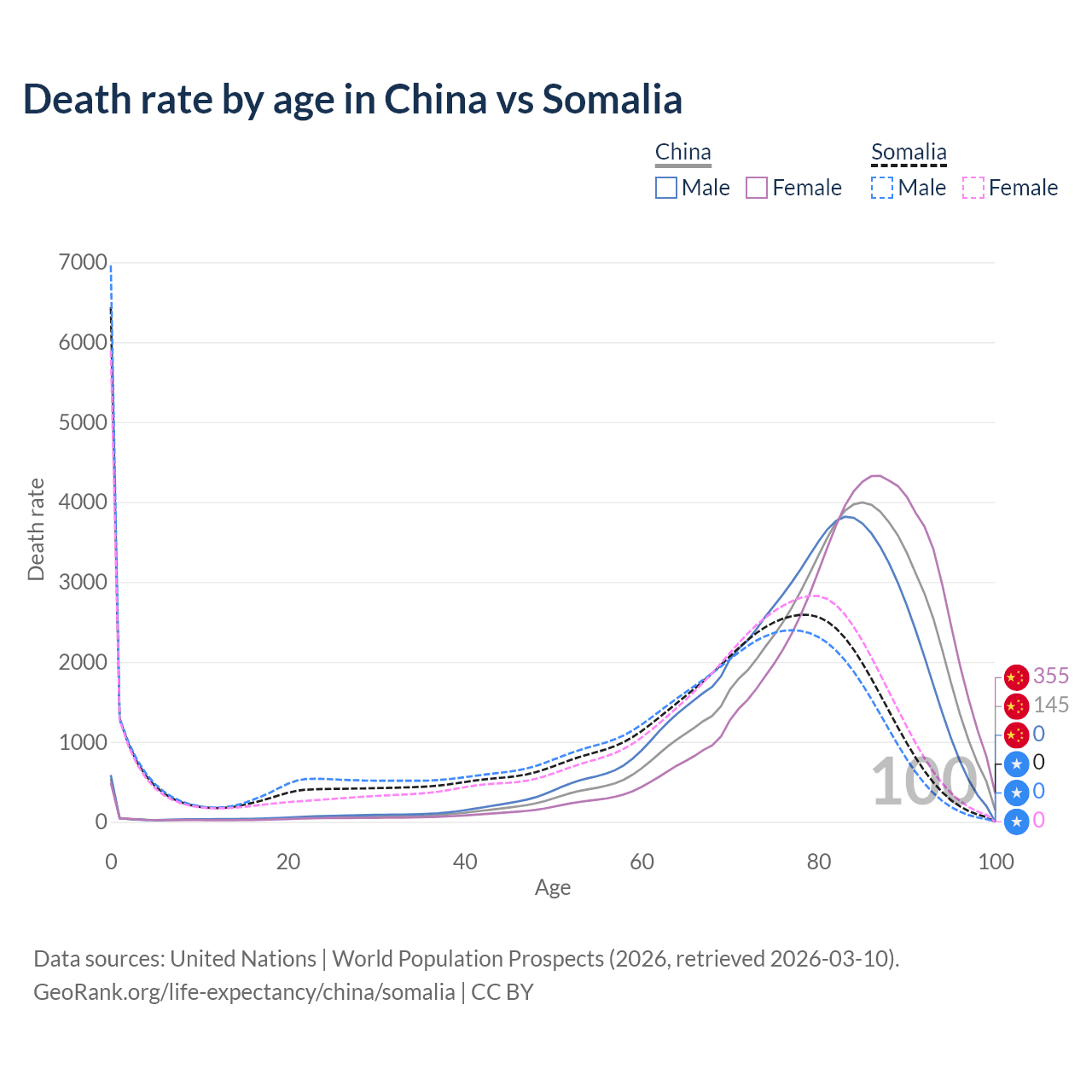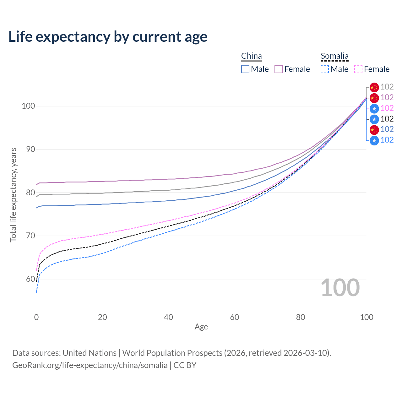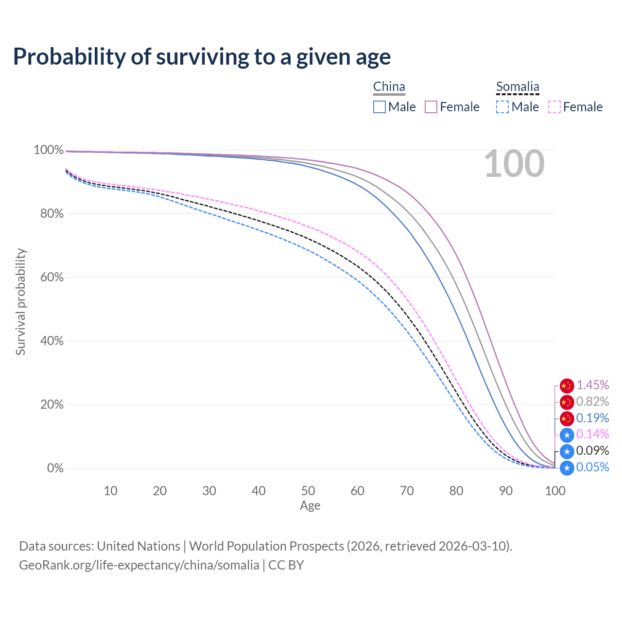 This life expectancy calculator shows the odds of living to 100, 95, 90, and below based on current age for both males and females in China and Somalia, along with mean and median age of death. The calculations are based on the 2026 life tables (actuarial tables) from the UN World Population Prospects.