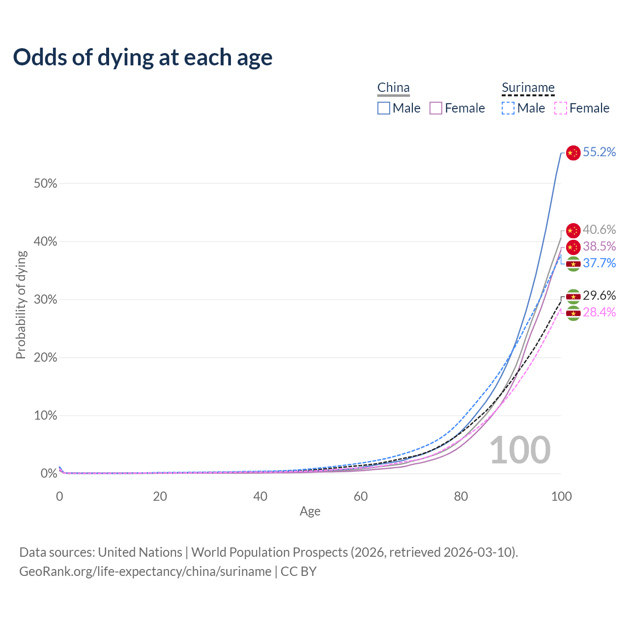 This life expectancy calculator shows the odds of living to 100, 95, 90, and below based on current age for both males and females in China and Suriname, along with mean and median age of death. The calculations are based on the 2026 life tables (actuarial tables) from the UN World Population Prospects.