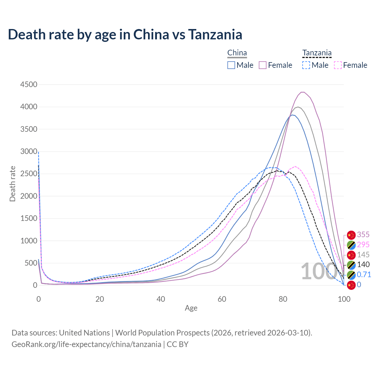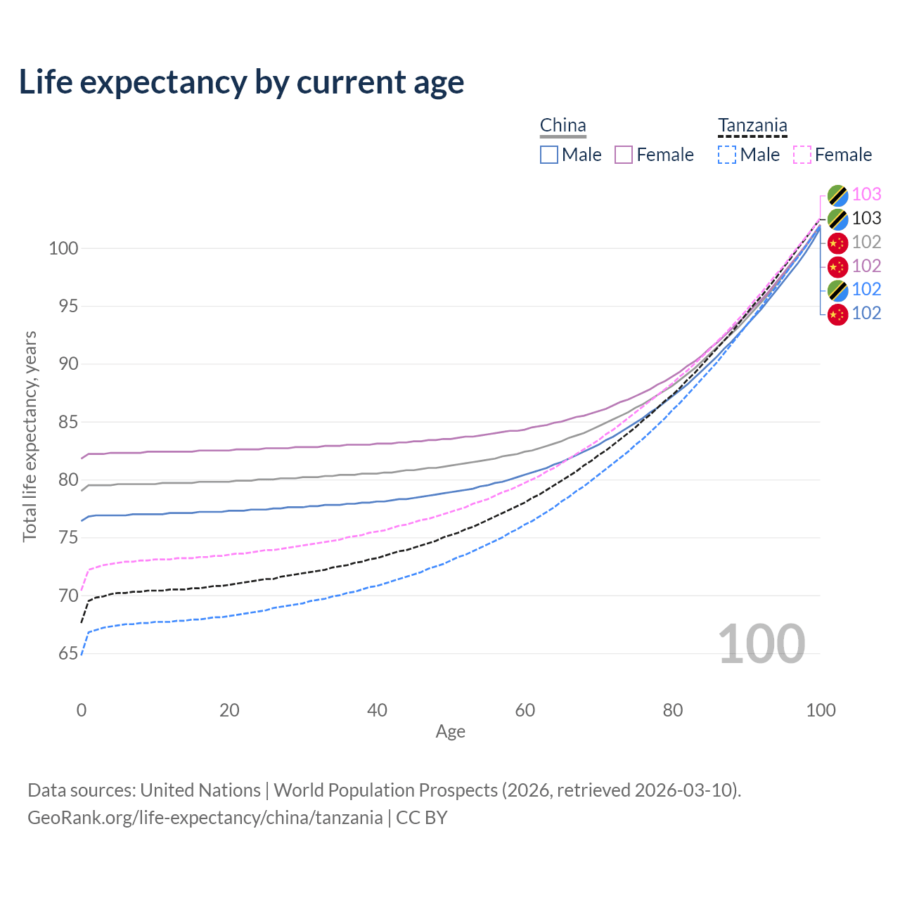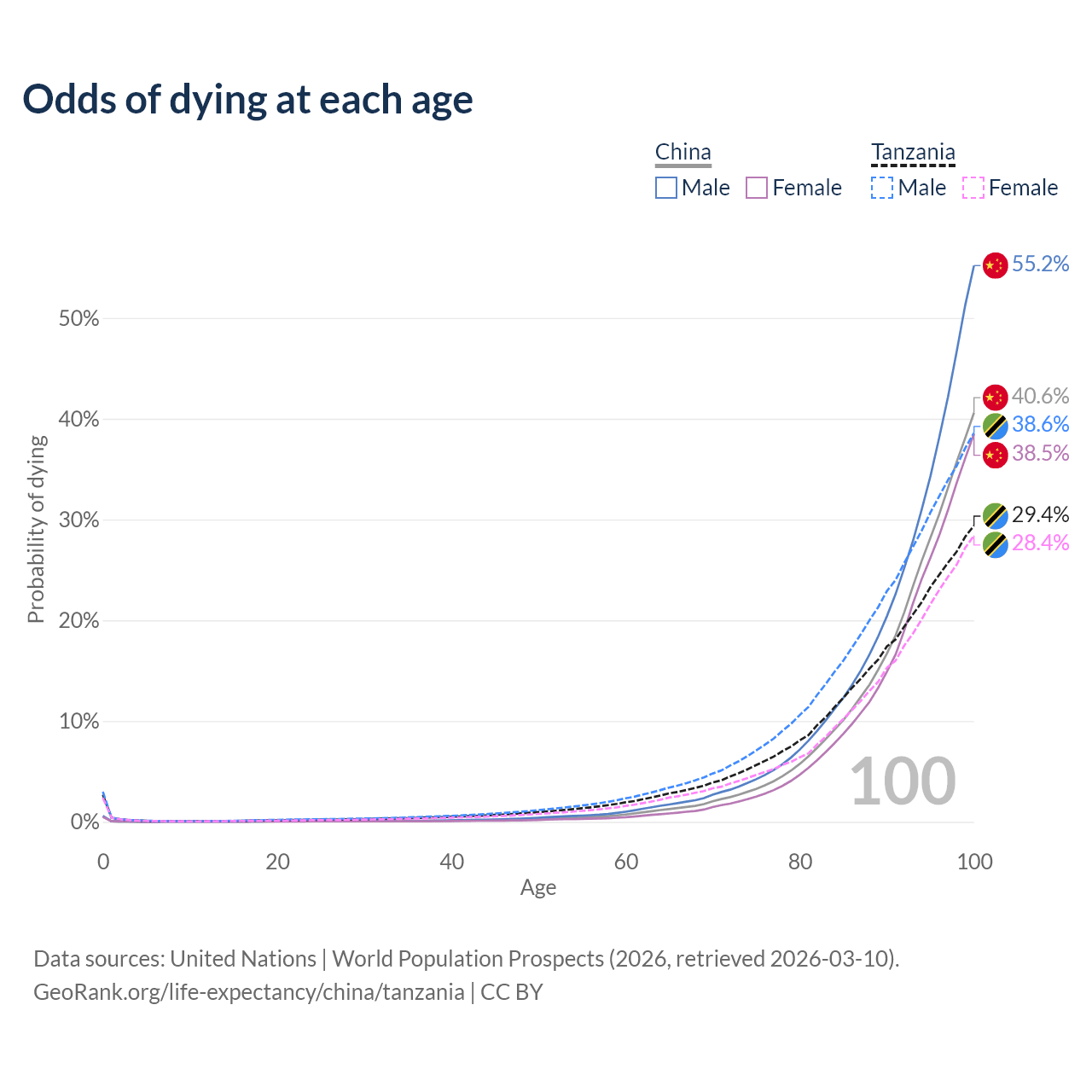 This life expectancy calculator shows the odds of living to 100, 95, 90, and below based on current age for both males and females in China and Tanzania, along with mean and median age of death. The calculations are based on the 2026 life tables (actuarial tables) from the UN World Population Prospects.