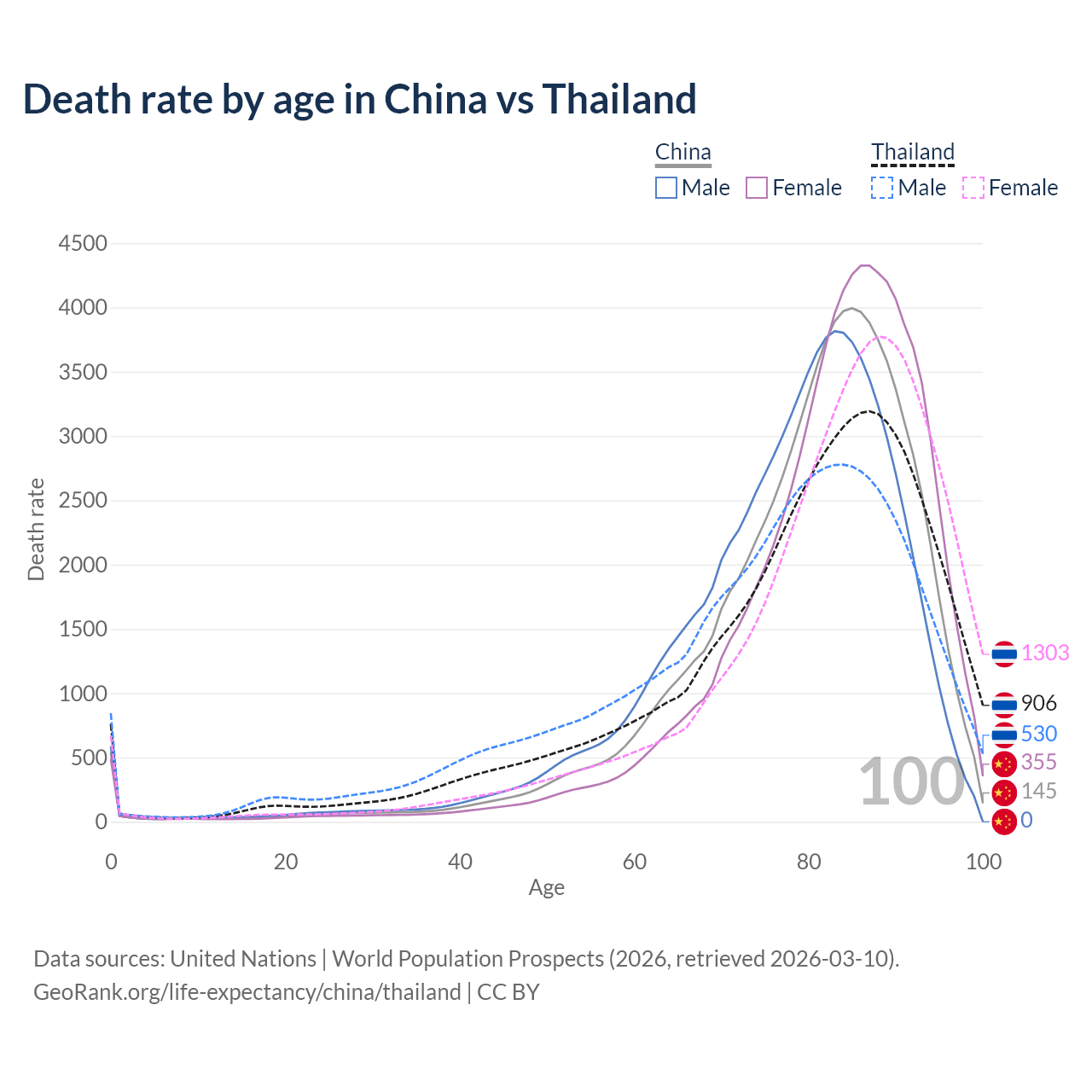 In China, the most common age of death is 85, compared to 87 in Thailand. The median age of death is 82.3 in China and 81.8 in Thailand, meaning only half of each cohort is expected to live past that age.