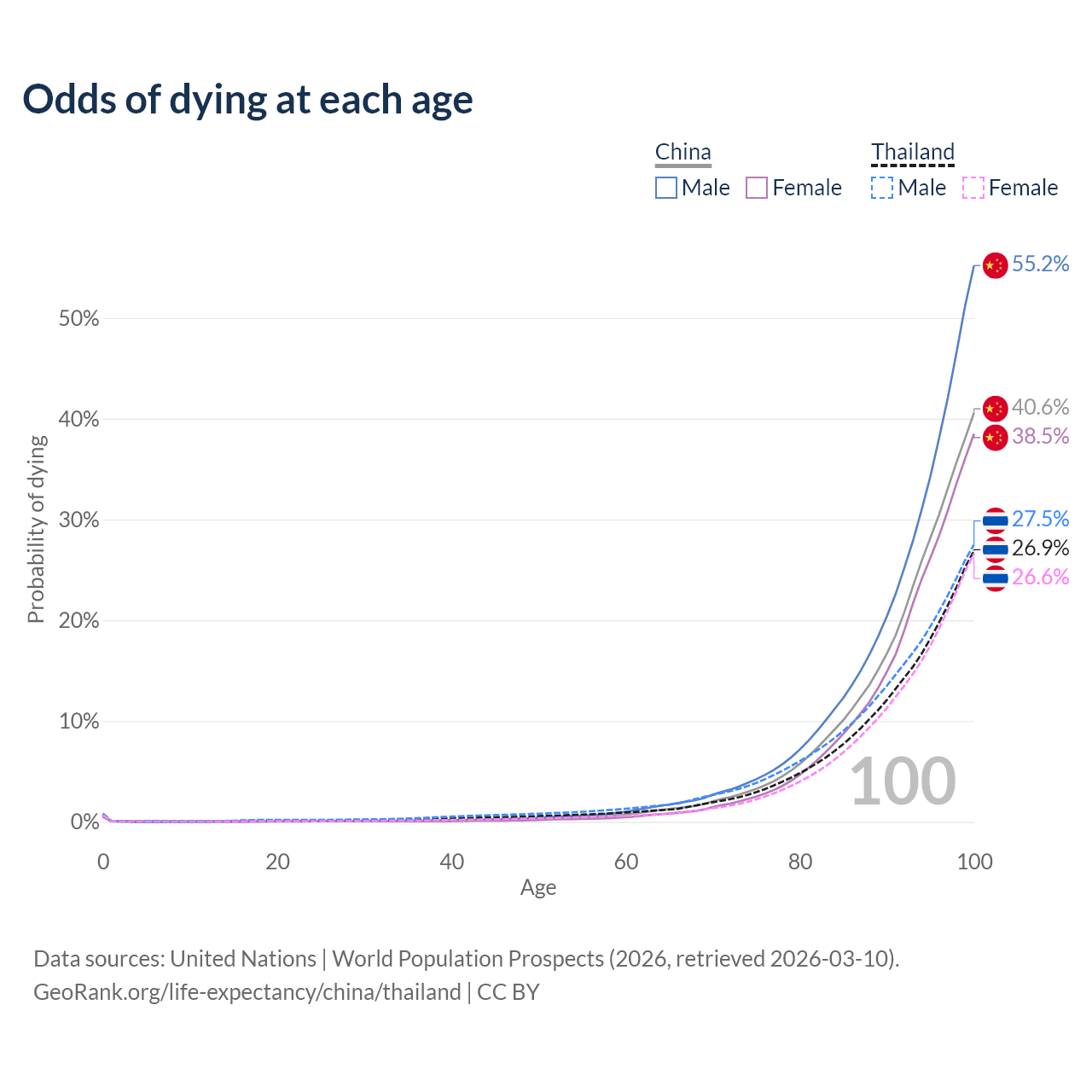 This life expectancy calculator shows the odds of living to 100, 95, 90, and below based on current age for both males and females in China and Thailand, along with mean and median age of death. The calculations are based on the 2026 life tables (actuarial tables) from the UN World Population Prospects.