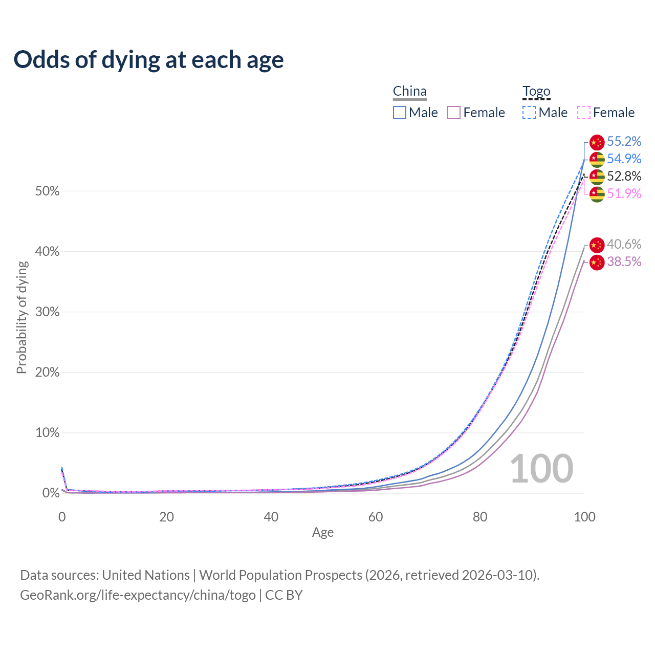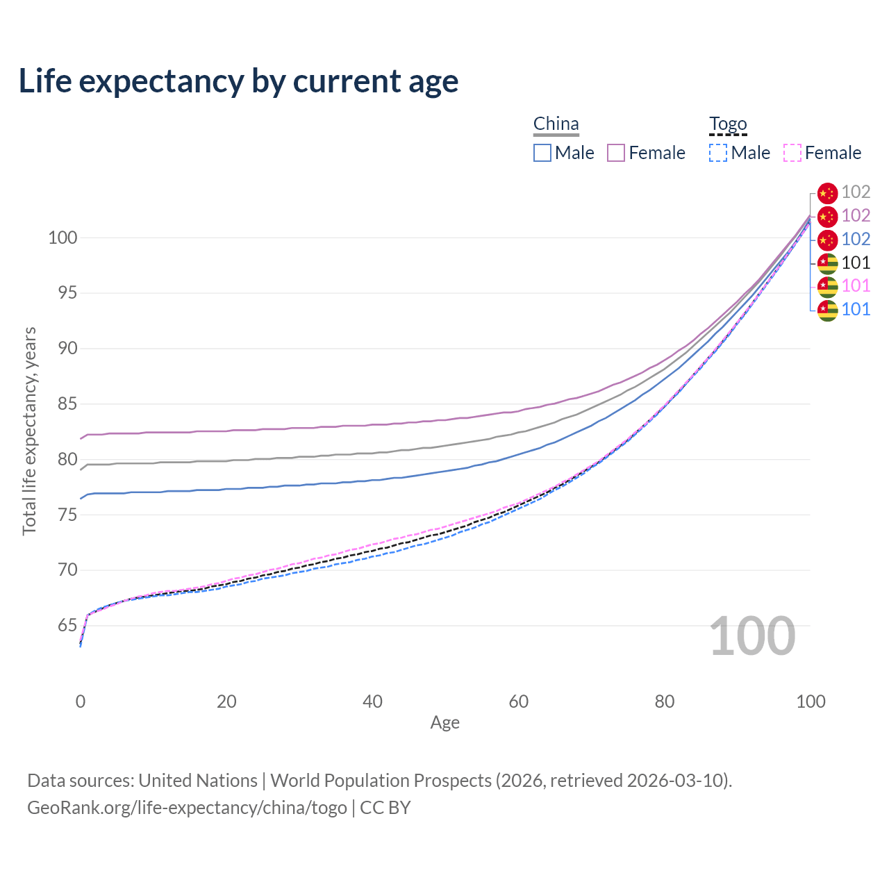 This life expectancy calculator shows the odds of living to 100, 95, 90, and below based on current age for both males and females in China and Togo, along with mean and median age of death. The calculations are based on the 2026 life tables (actuarial tables) from the UN World Population Prospects.