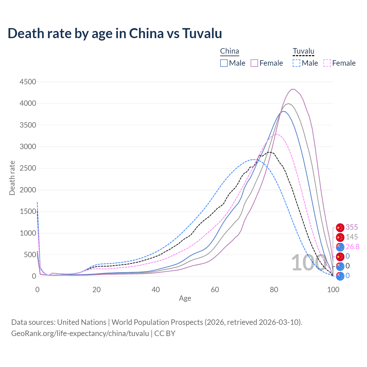 In China, the most common age of death is 85, compared to 78 in Tuvalu. The median age of death is 82.3 in China and 71.9 in Tuvalu, meaning only half of each cohort is expected to live past that age.