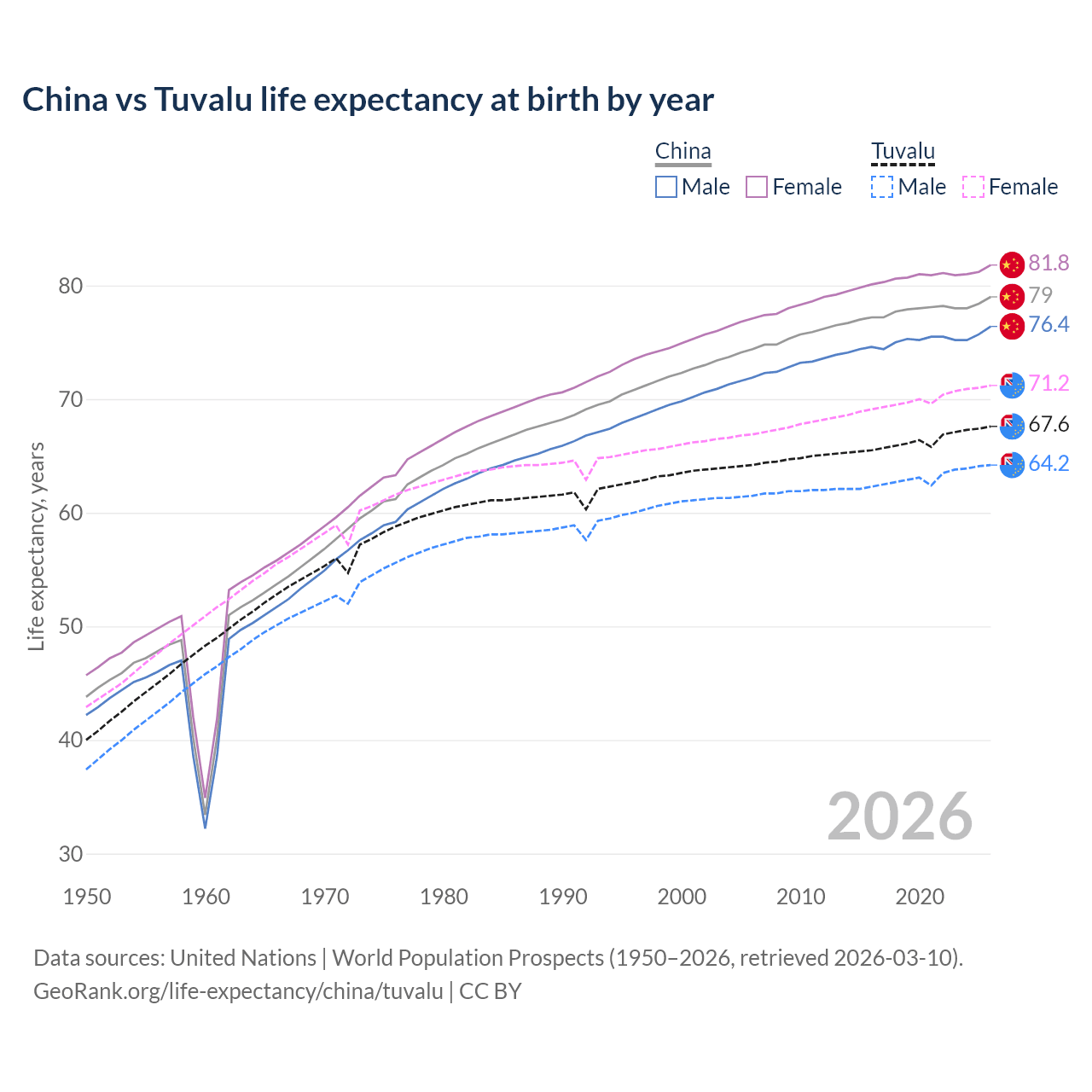 The average life expectancy at birth is 79 years in China vs 67.6 in Tuvalu. China is ranked 52/197 by life expectancy, and Tuvalu is 156/197. In China, the life expectancy is 76.4 years for males and 81.8 years for females. In Tuvalu, it's 64.2 years for males and 71.2 years for females.