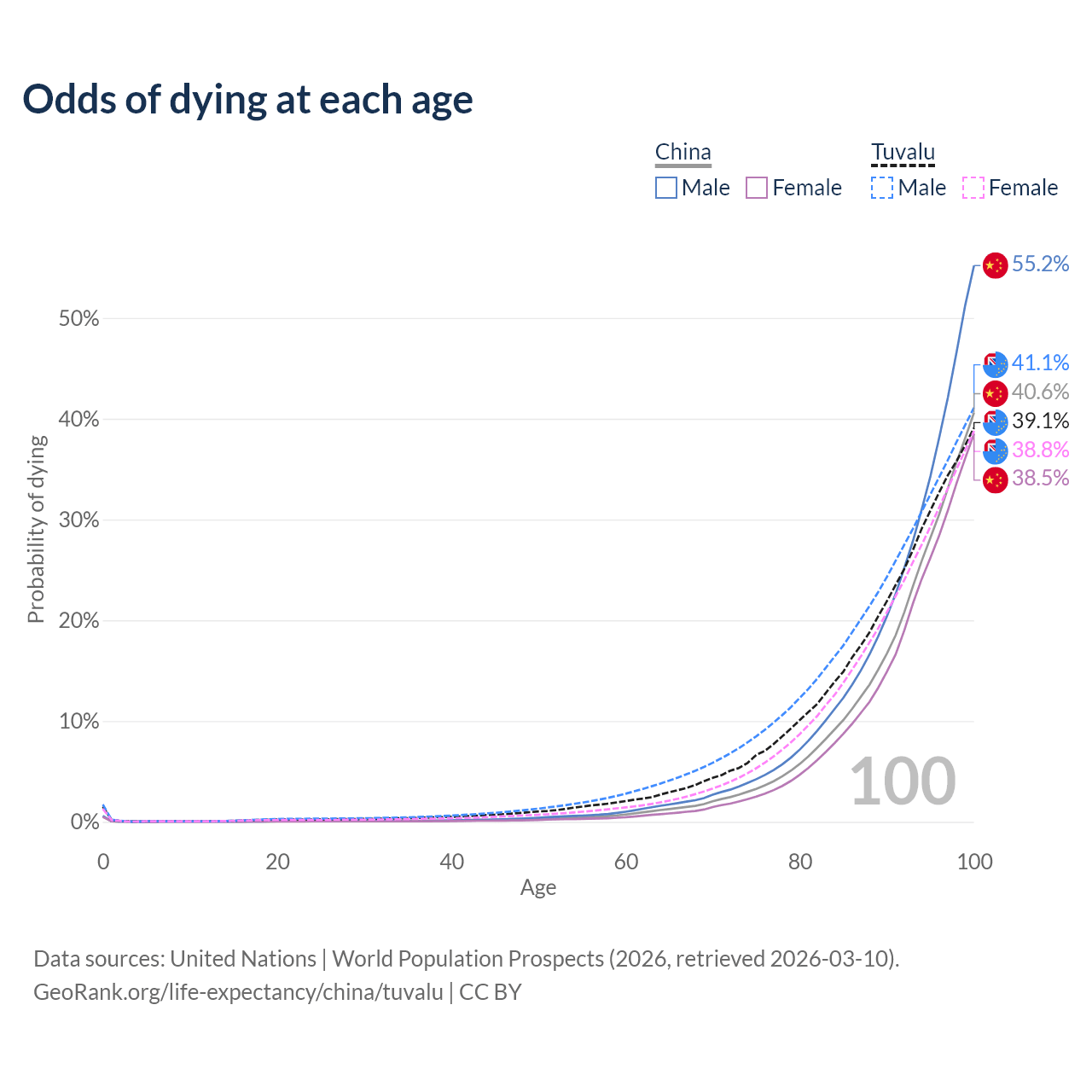 This life expectancy calculator shows the odds of living to 100, 95, 90, and below based on current age for both males and females in China and Tuvalu, along with mean and median age of death. The calculations are based on the 2026 life tables (actuarial tables) from the UN World Population Prospects.