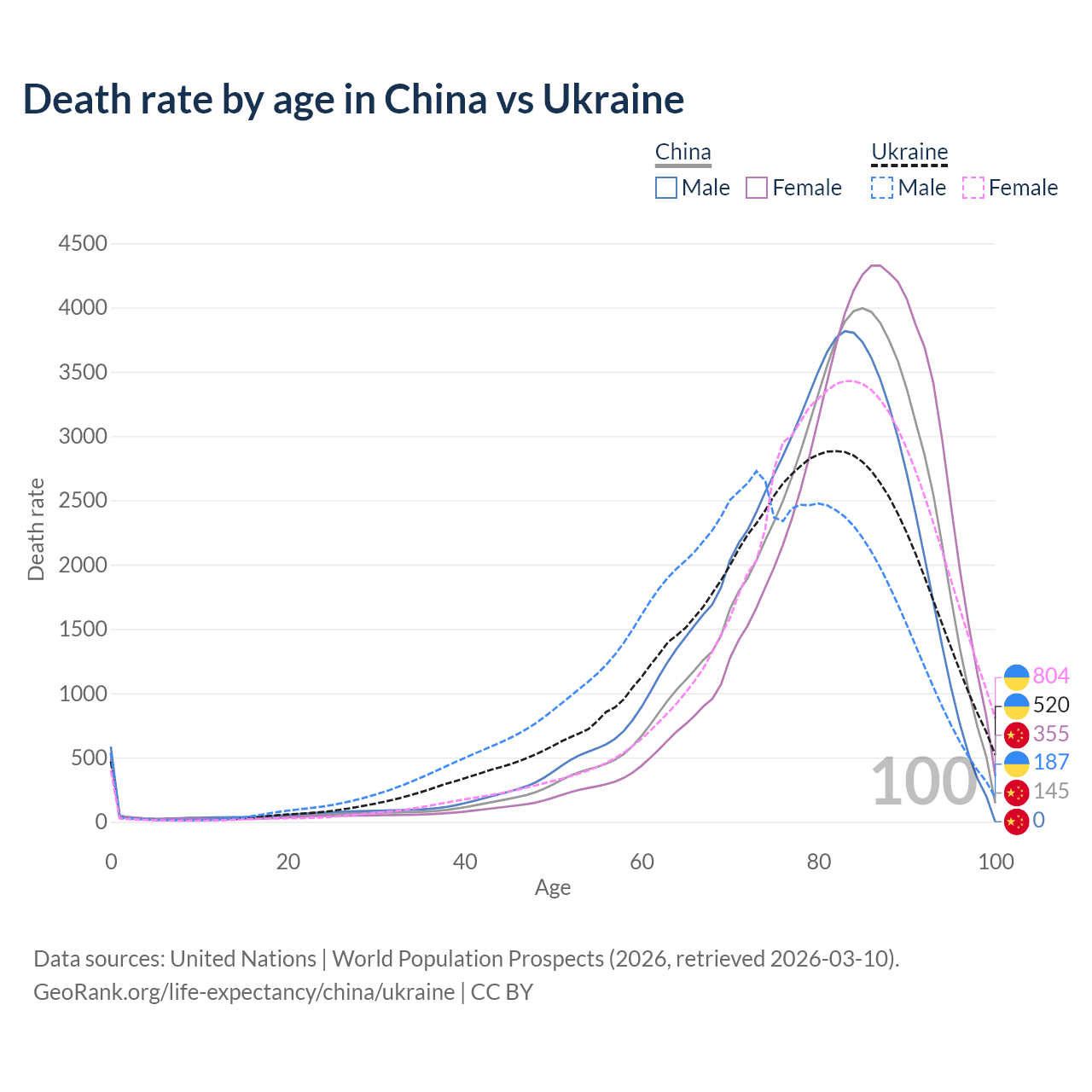 In China, the most common age of death is 85, compared to 82 in Ukraine. The median age of death is 82.3 in China and 78 in Ukraine, meaning only half of each cohort is expected to live past that age.