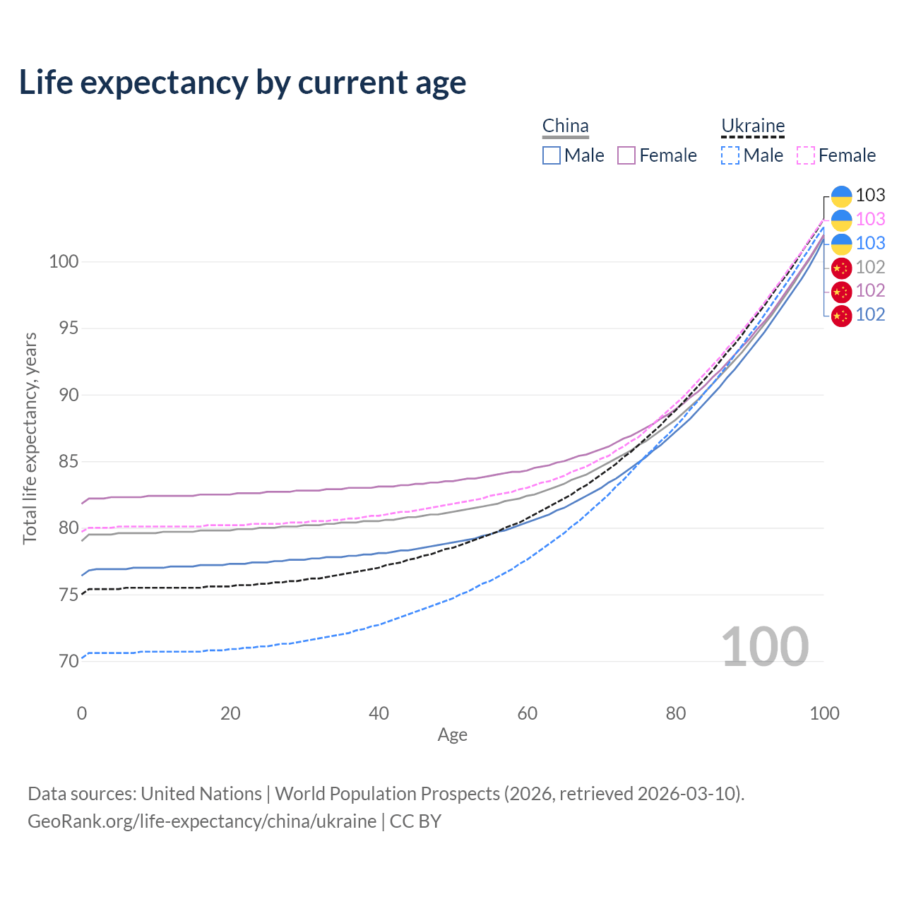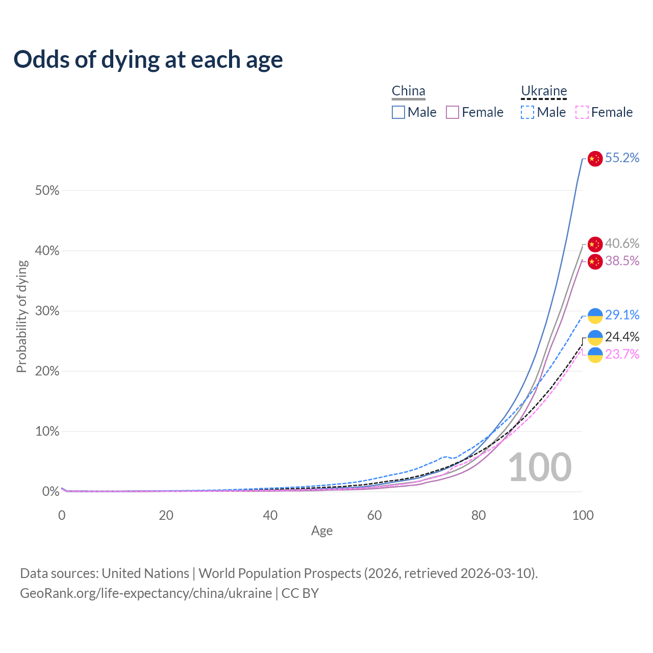 This life expectancy calculator shows the odds of living to 100, 95, 90, and below based on current age for both males and females in China and Ukraine, along with mean and median age of death. The calculations are based on the 2026 life tables (actuarial tables) from the UN World Population Prospects.
