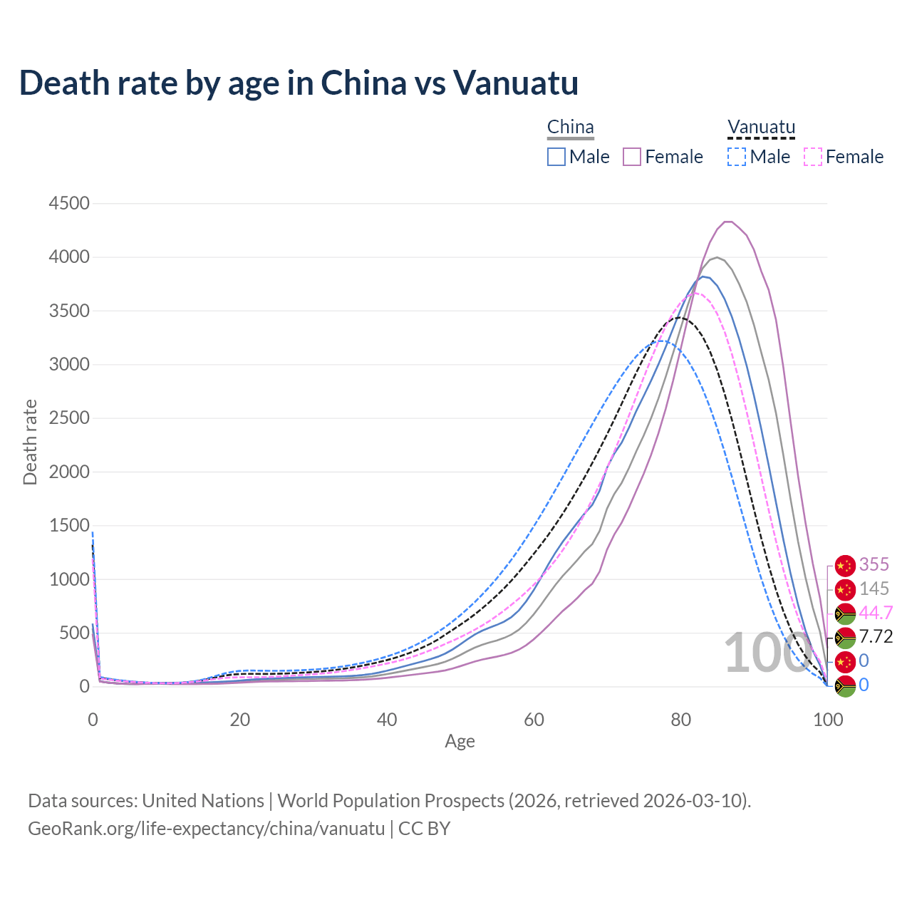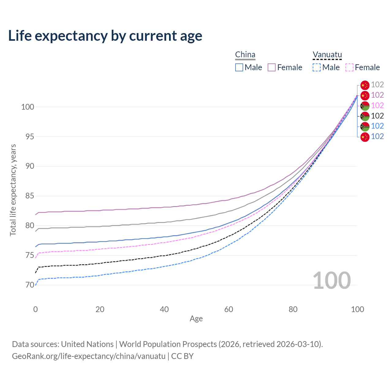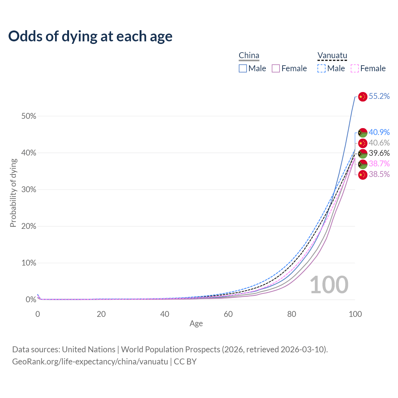This life expectancy calculator shows the odds of living to 100, 95, 90, and below based on current age for both males and females in China and Vanuatu, along with mean and median age of death. The calculations are based on the 2026 life tables (actuarial tables) from the UN World Population Prospects.