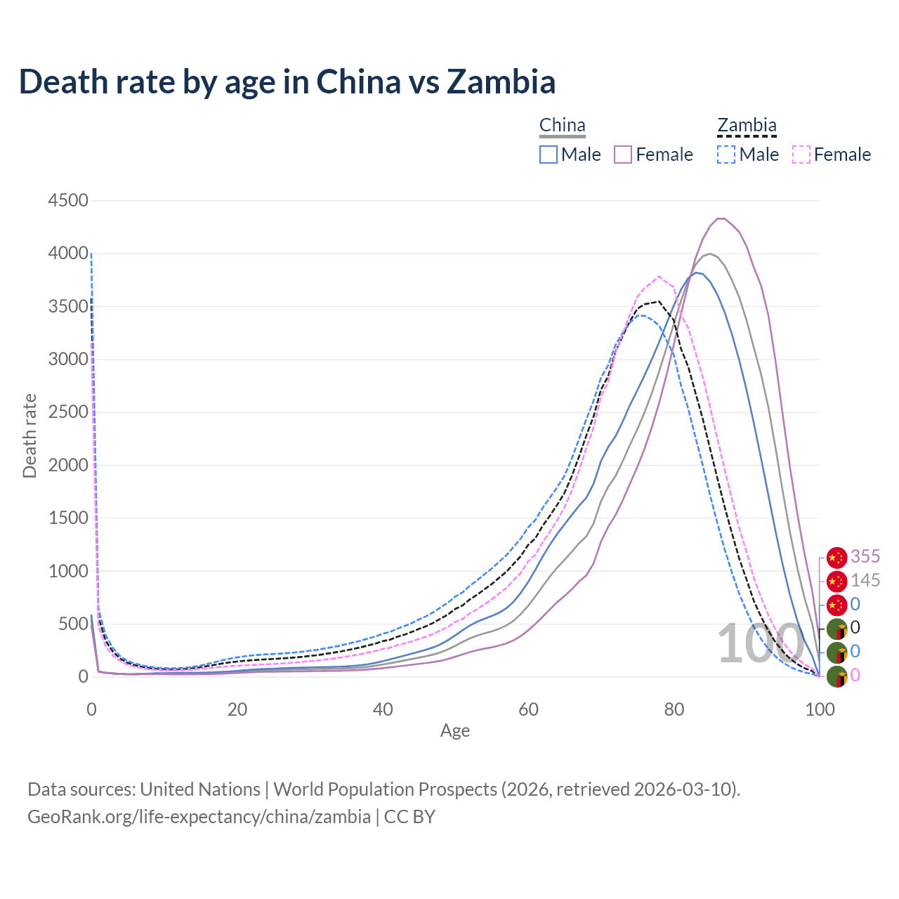 In China, the most common age of death is 85, compared to 0 in Zambia. The median age of death is 82.3 in China and 73.1 in Zambia, meaning only half of each cohort is expected to live past that age.