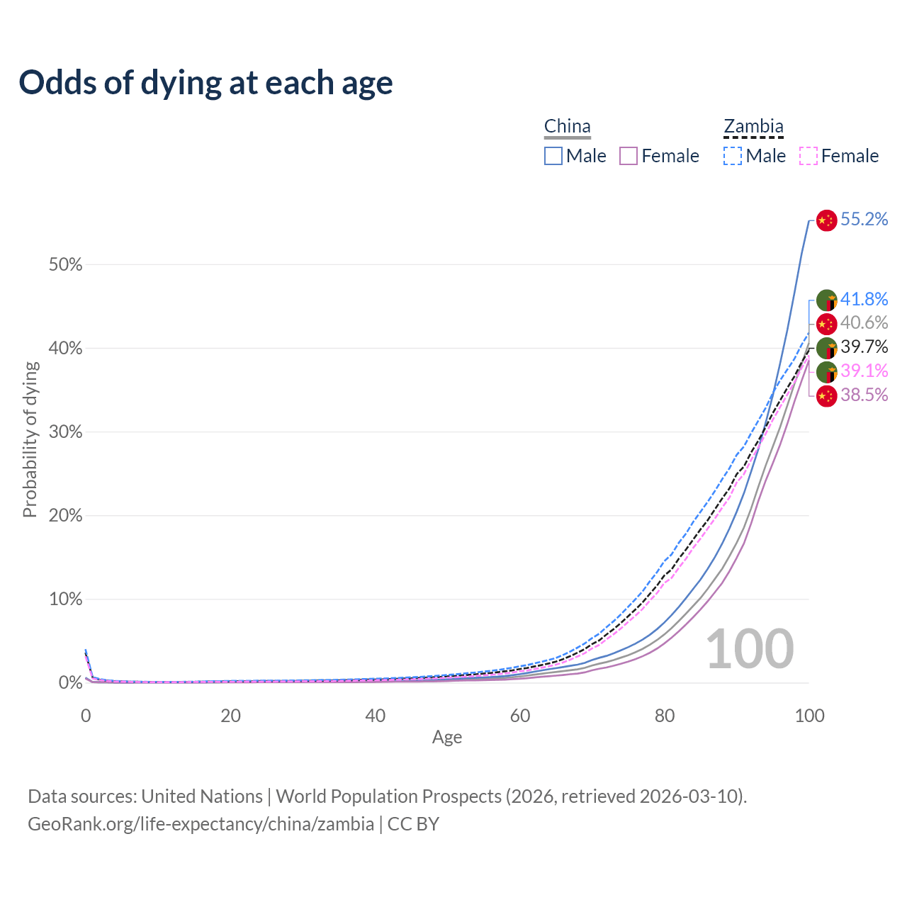 This life expectancy calculator shows the odds of living to 100, 95, 90, and below based on current age for both males and females in China and Zambia, along with mean and median age of death. The calculations are based on the 2026 life tables (actuarial tables) from the UN World Population Prospects.