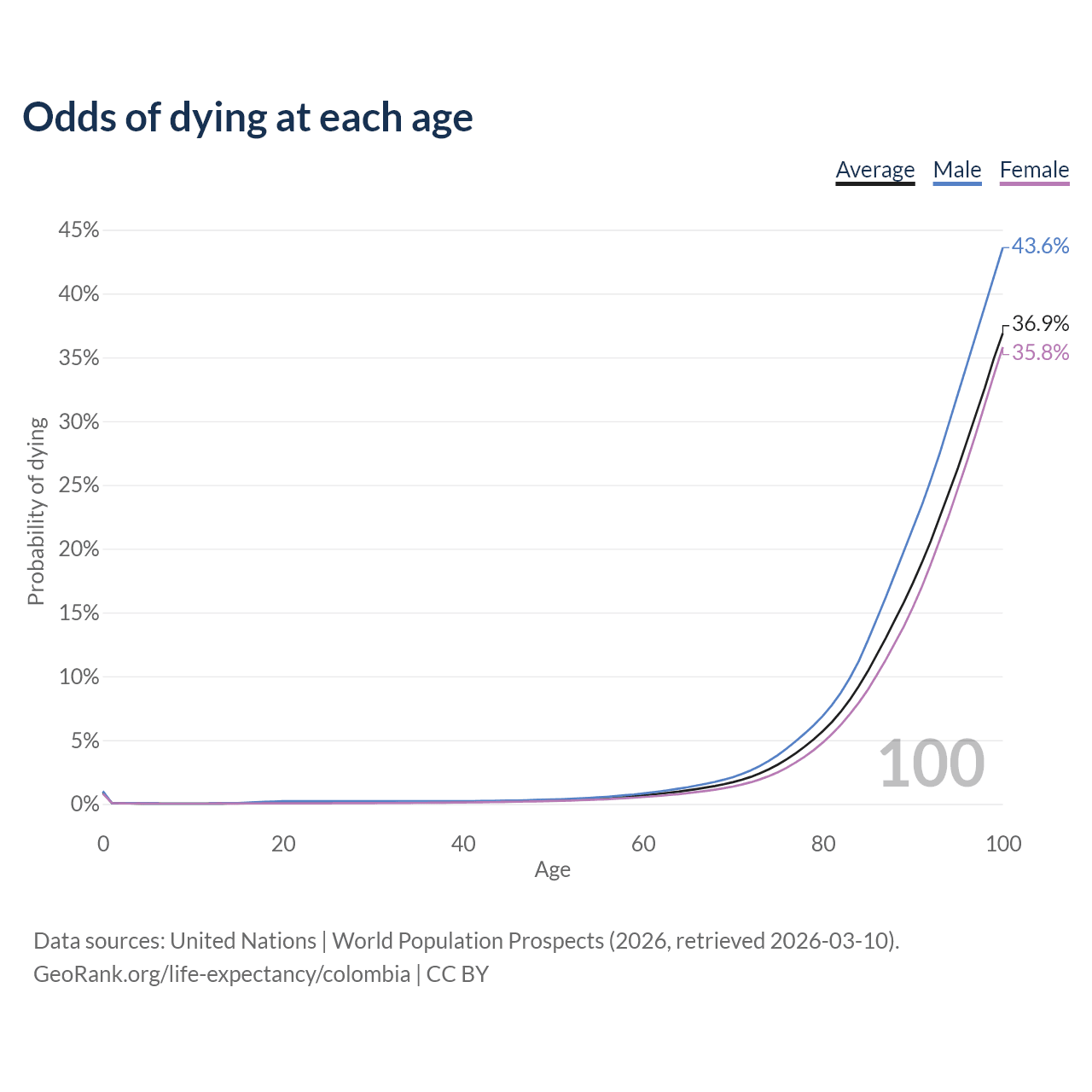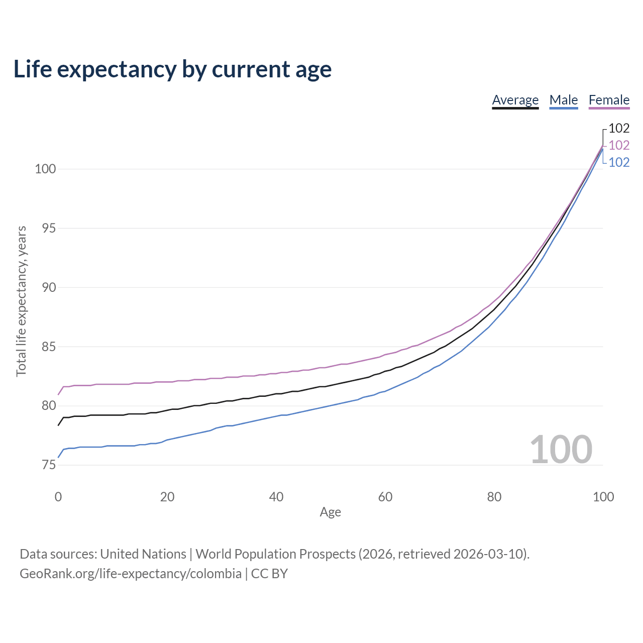 This life expectancy calculator shows the odds of living to 100, 95, 90, and below based on current age for both males and females in Colombia, along with mean and median age of death. The calculations are based on the 2026 life tables (actuarial tables) from the UN World Population Prospects.