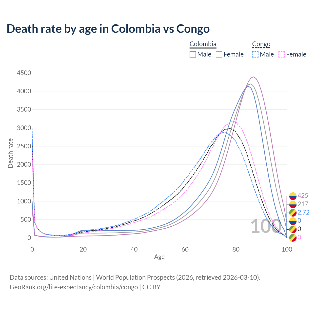 In Colombia, the most common age of death is 86, compared to 78 in the Congo. The median age of death is 82.5 in Colombia and 71.8 in the Congo, meaning only half of each cohort is expected to live past that age.