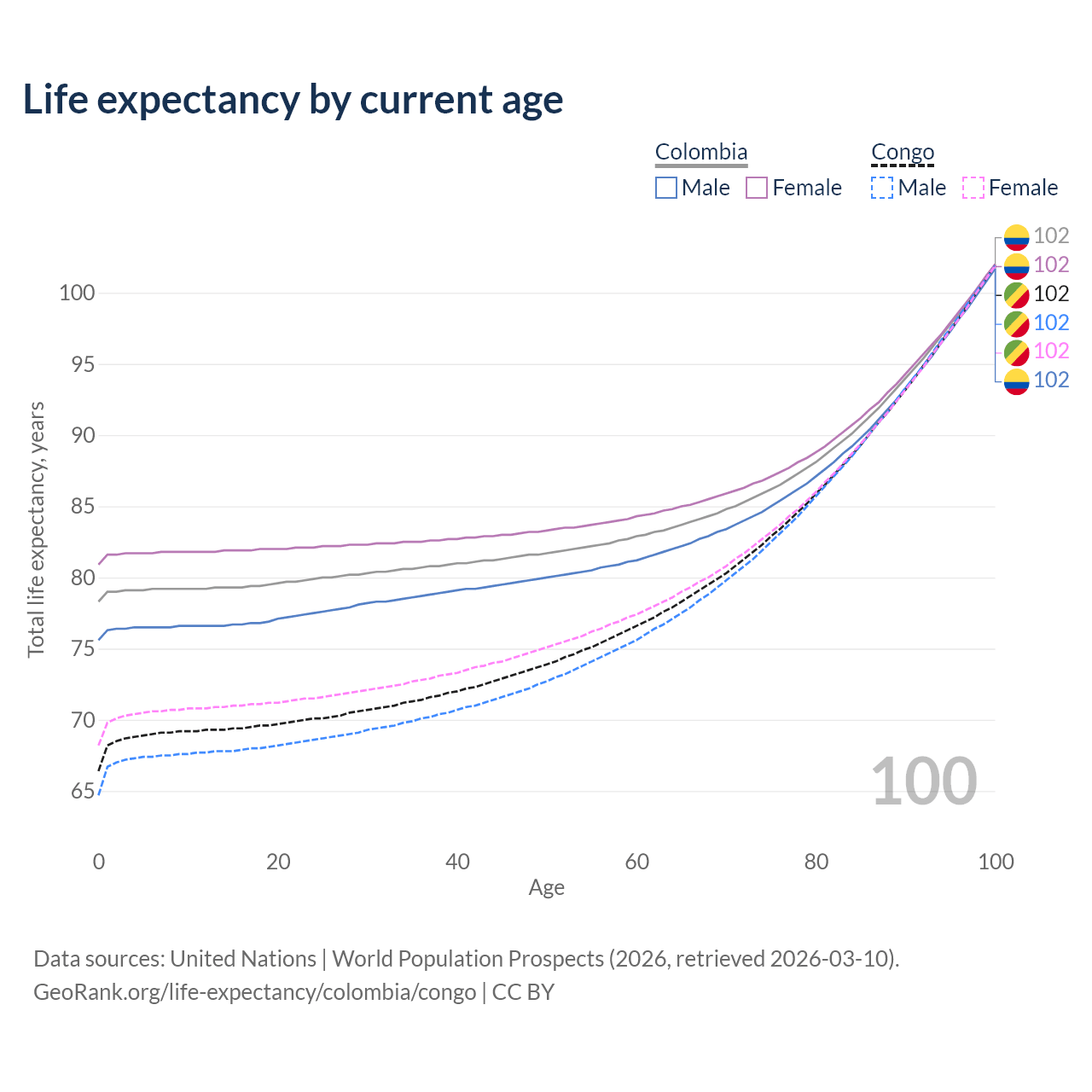 This life expectancy calculator shows the odds of living to 100, 95, 90, and below based on current age for both males and females in Colombia and the Congo, along with mean and median age of death. The calculations are based on the 2026 life tables (actuarial tables) from the UN World Population Prospects.