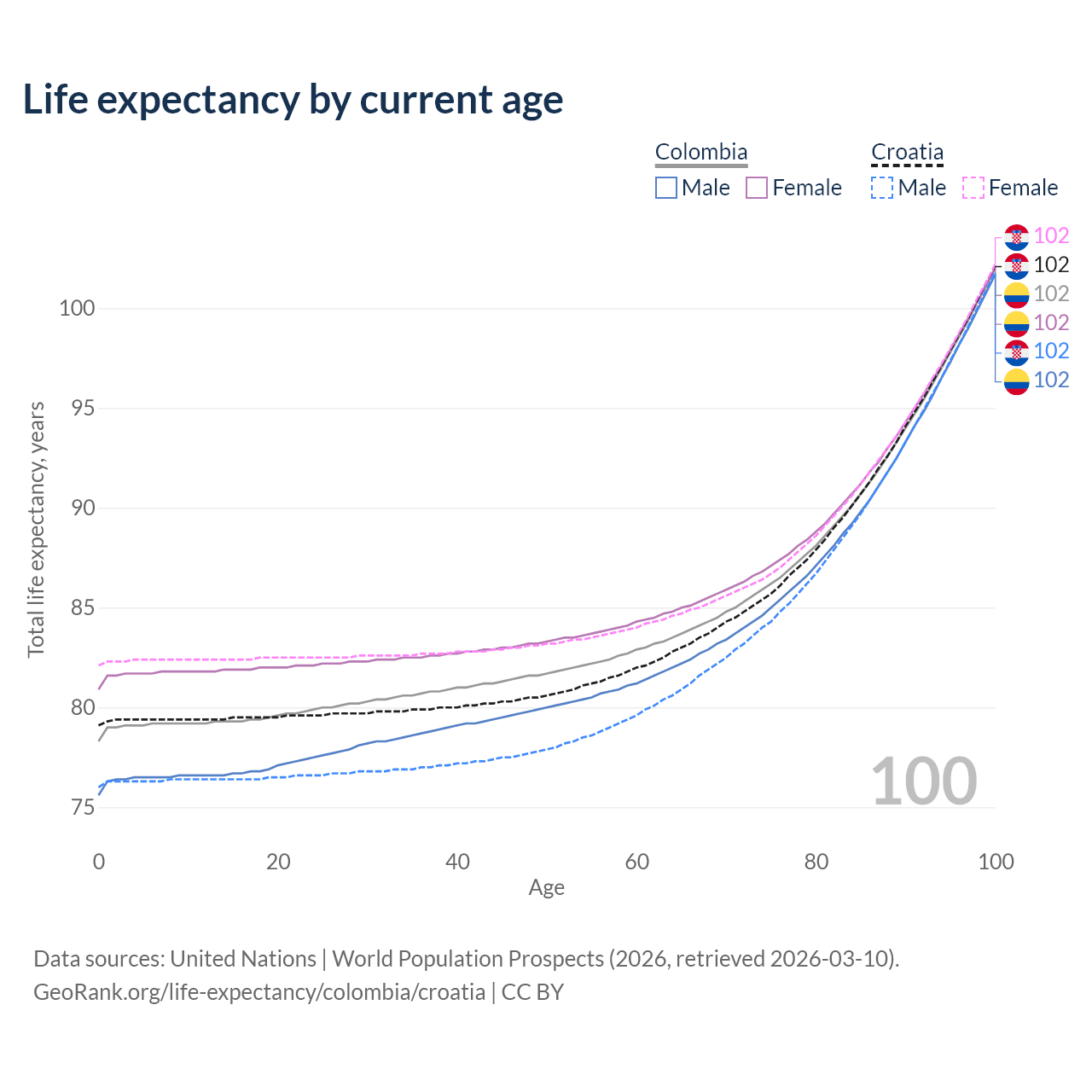 This life expectancy calculator shows the odds of living to 100, 95, 90, and below based on current age for both males and females in Colombia and Croatia, along with mean and median age of death. The calculations are based on the 2026 life tables (actuarial tables) from the UN World Population Prospects.