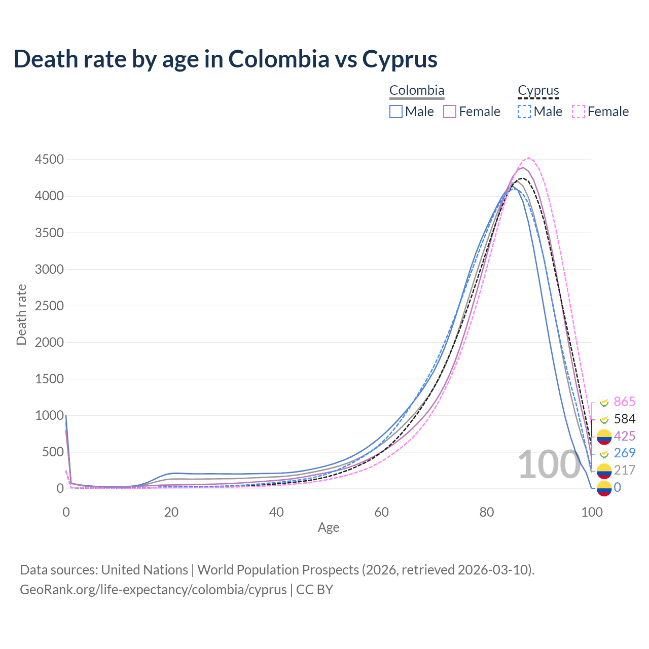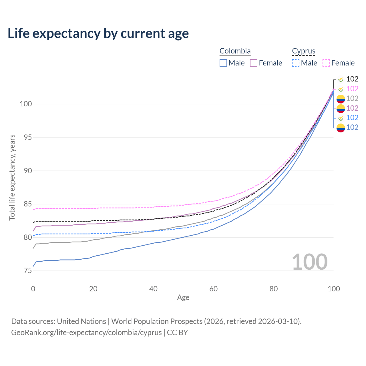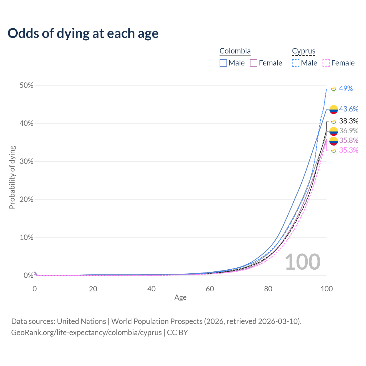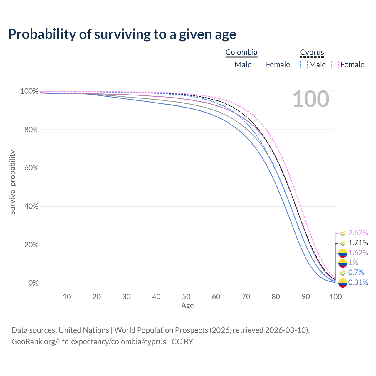 This life expectancy calculator shows the odds of living to 100, 95, 90, and below based on current age for both males and females in Colombia and Cyprus, along with mean and median age of death. The calculations are based on the 2026 life tables (actuarial tables) from the UN World Population Prospects.