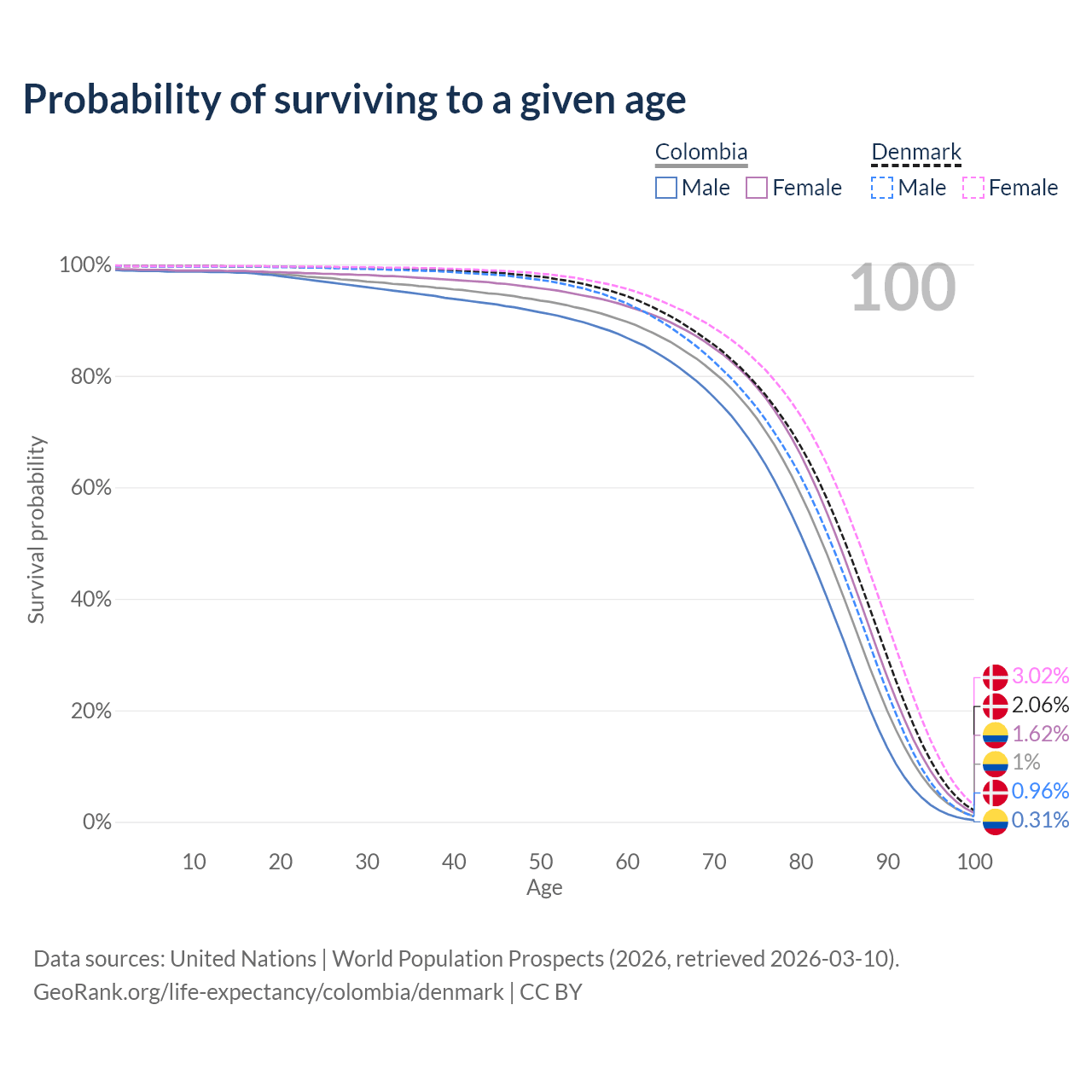 This life expectancy calculator shows the odds of living to 100, 95, 90, and below based on current age for both males and females in Colombia and Denmark, along with mean and median age of death. The calculations are based on the 2026 life tables (actuarial tables) from the UN World Population Prospects.