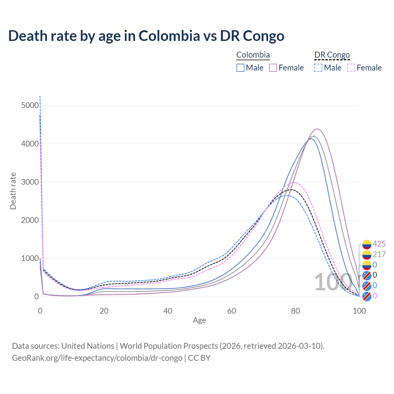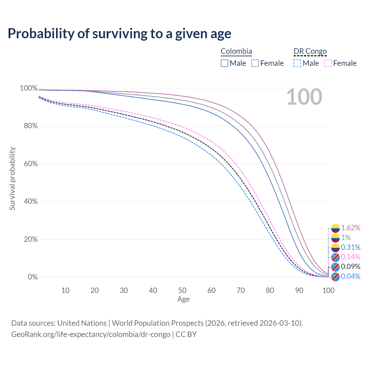 This life expectancy calculator shows the odds of living to 100, 95, 90, and below based on current age for both males and females in Colombia and the DR Congo, along with mean and median age of death. The calculations are based on the 2026 life tables (actuarial tables) from the UN World Population Prospects.