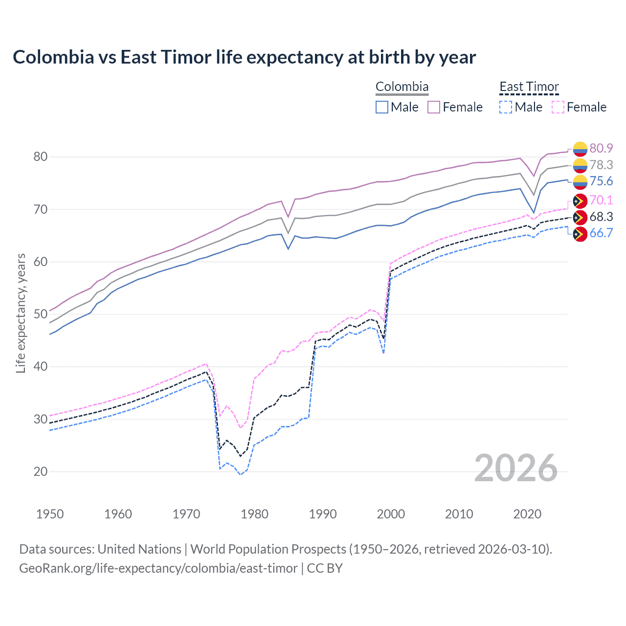 The average life expectancy at birth is 78.3 years in Colombia vs 68.3 in East Timor. Colombia is ranked 60/197 by life expectancy, and East Timor is 149/197. In Colombia, the life expectancy is 75.6 years for males and 80.9 years for females. In East Timor, it's 66.7 years for males and 70.1 years for females.