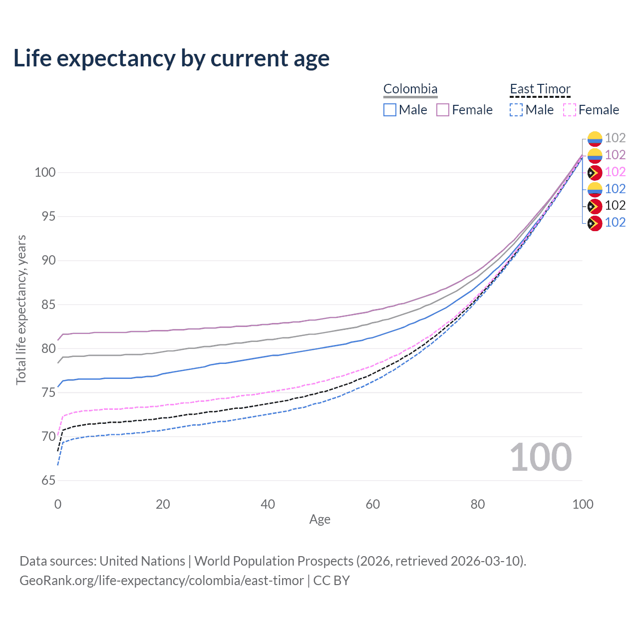 This life expectancy calculator shows the odds of living to 100, 95, 90, and below based on current age for both males and females in Colombia and East Timor, along with mean and median age of death. The calculations are based on the 2026 life tables (actuarial tables) from the UN World Population Prospects.