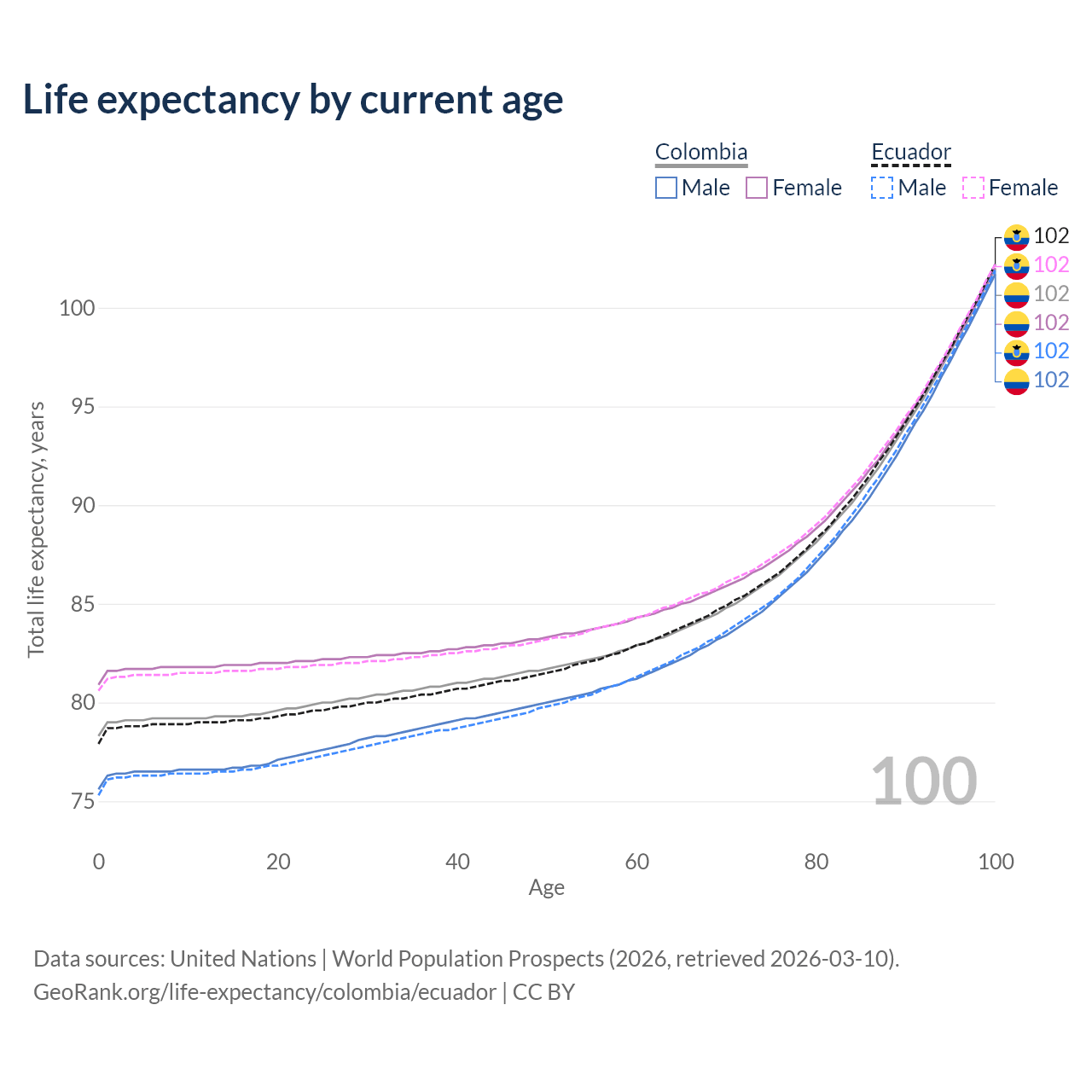 This life expectancy calculator shows the odds of living to 100, 95, 90, and below based on current age for both males and females in Colombia and Ecuador, along with mean and median age of death. The calculations are based on the 2026 life tables (actuarial tables) from the UN World Population Prospects.