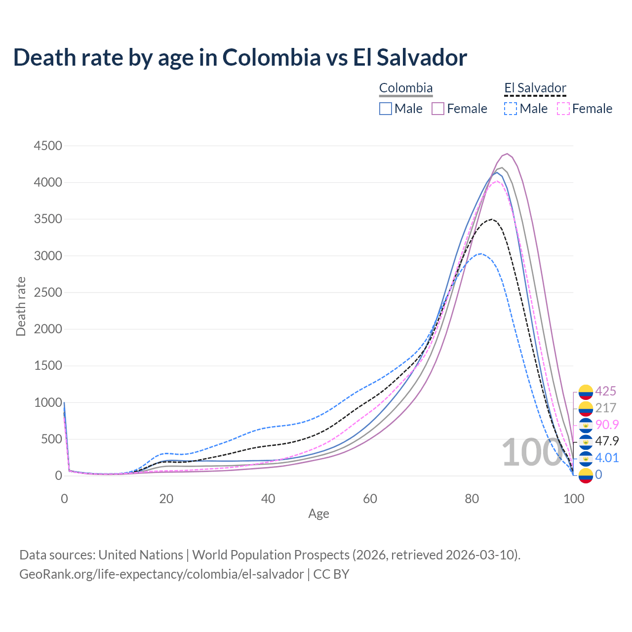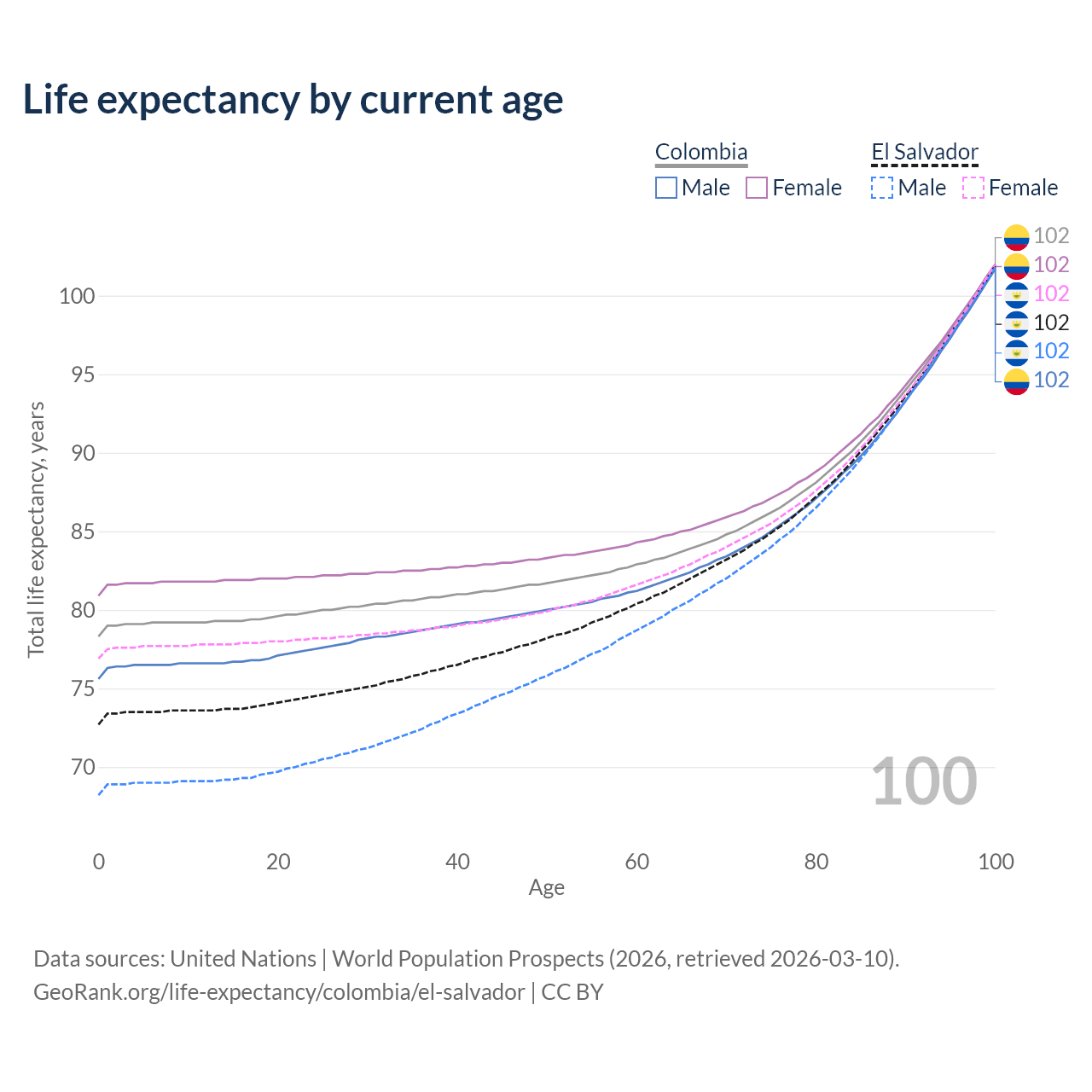 This life expectancy calculator shows the odds of living to 100, 95, 90, and below based on current age for both males and females in Colombia and El Salvador, along with mean and median age of death. The calculations are based on the 2026 life tables (actuarial tables) from the UN World Population Prospects.