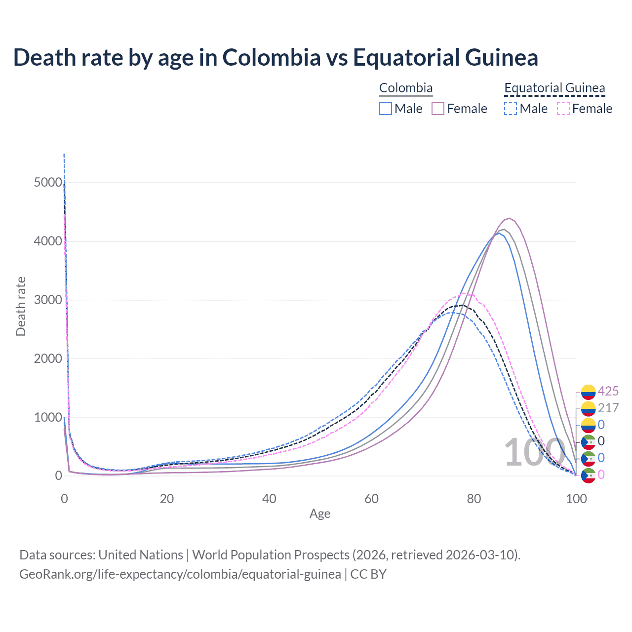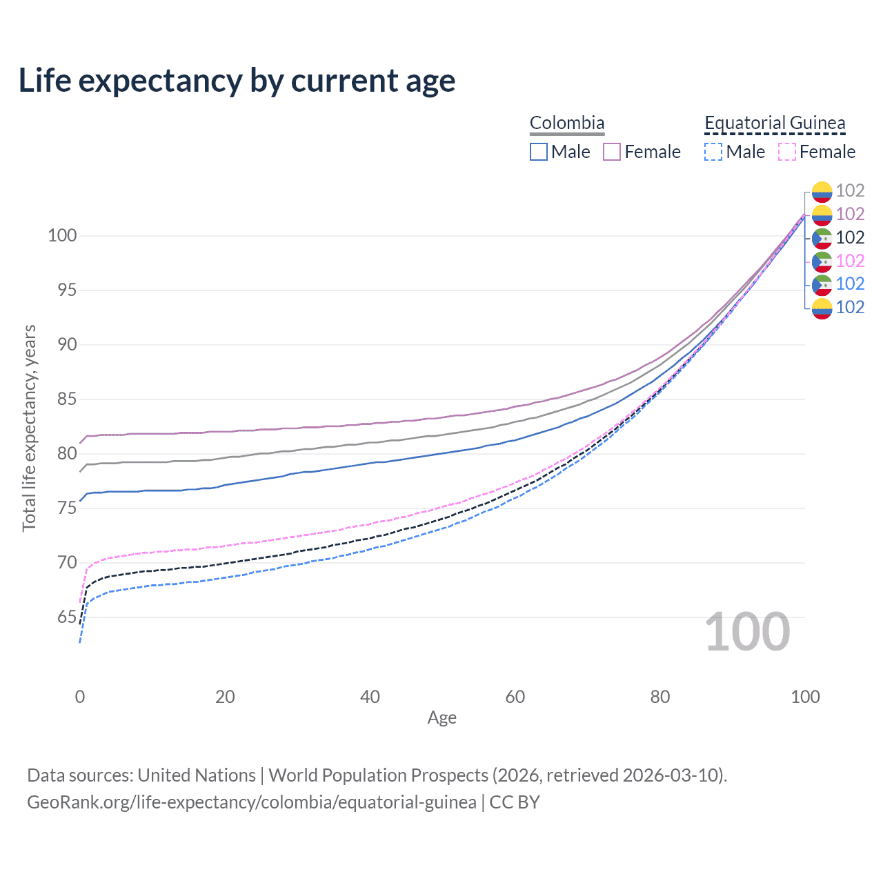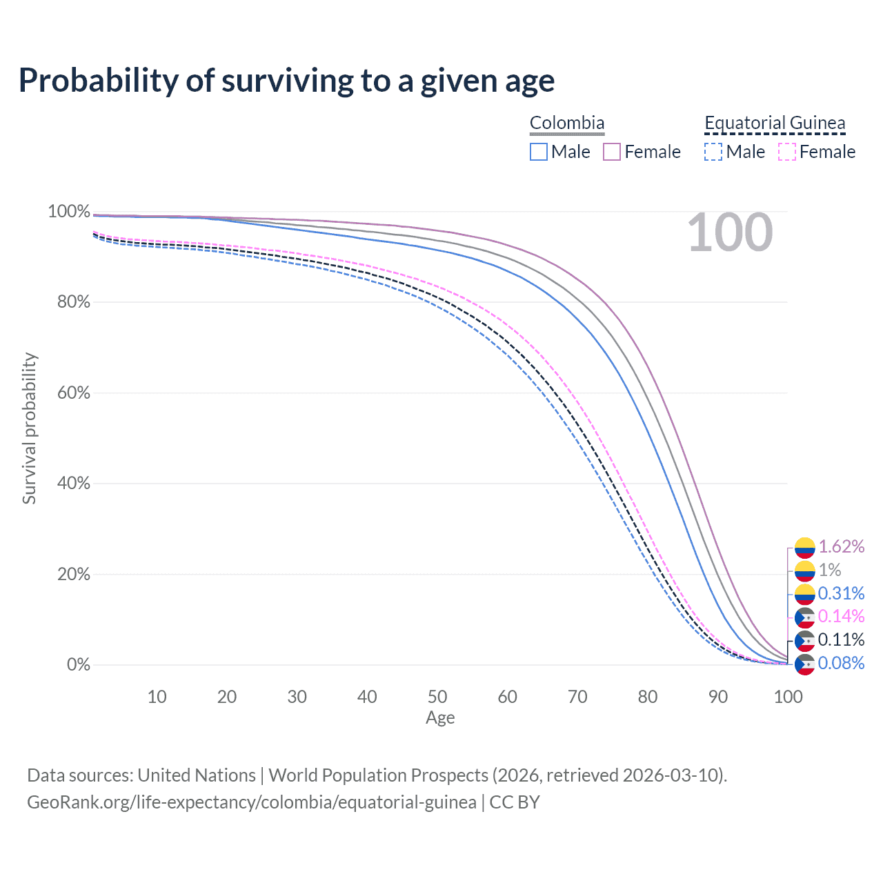 This life expectancy calculator shows the odds of living to 100, 95, 90, and below based on current age for both males and females in Colombia and Equatorial Guinea, along with mean and median age of death. The calculations are based on the 2026 life tables (actuarial tables) from the UN World Population Prospects.