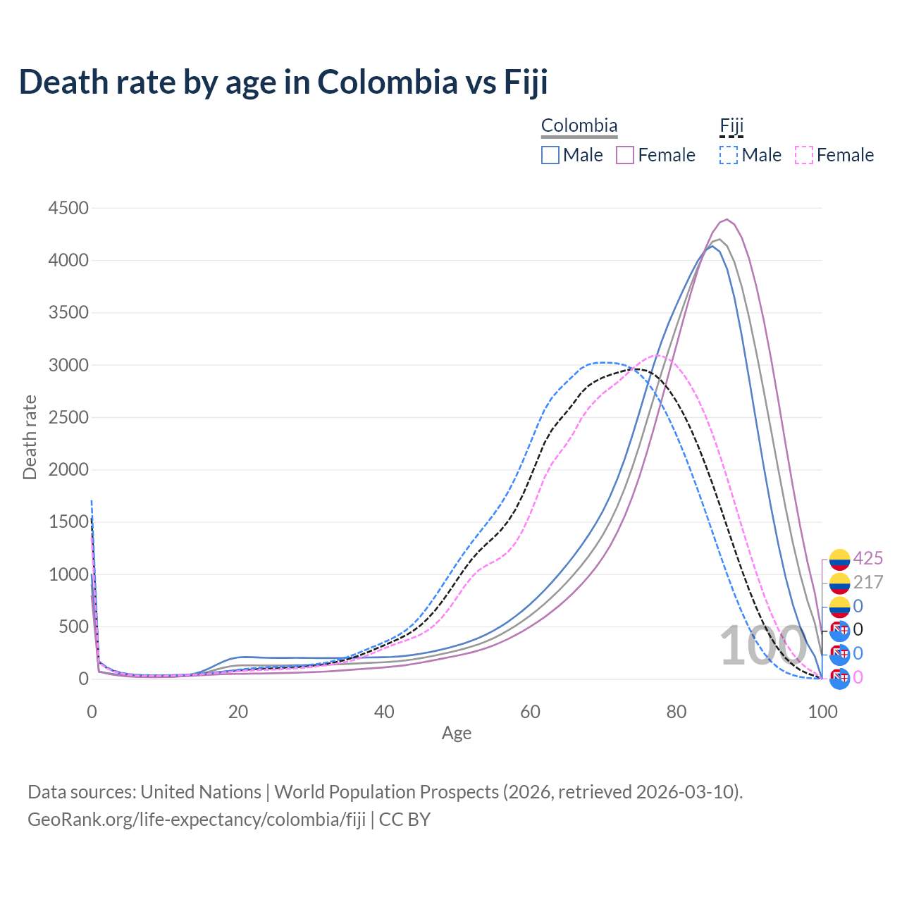 In Colombia, the most common age of death is 86, compared to 74 in Fiji. The median age of death is 82.5 in Colombia and 70.5 in Fiji, meaning only half of each cohort is expected to live past that age.