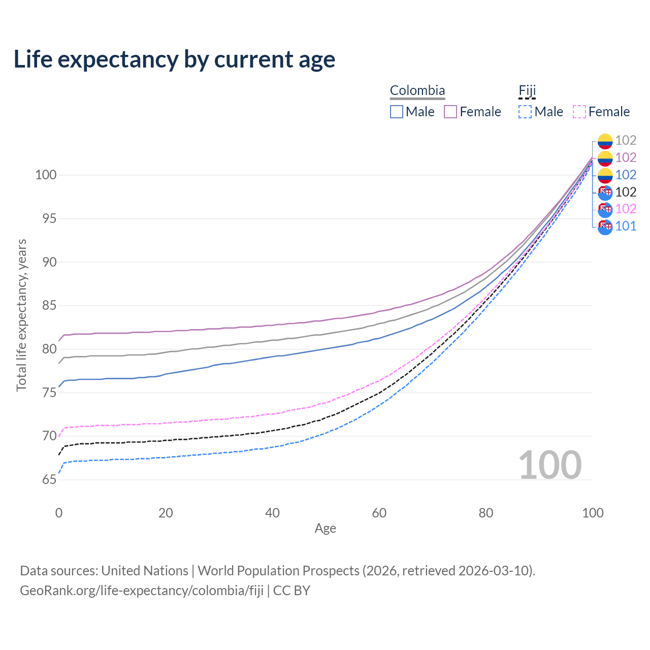 This life expectancy calculator shows the odds of living to 100, 95, 90, and below based on current age for both males and females in Colombia and Fiji, along with mean and median age of death. The calculations are based on the 2026 life tables (actuarial tables) from the UN World Population Prospects.