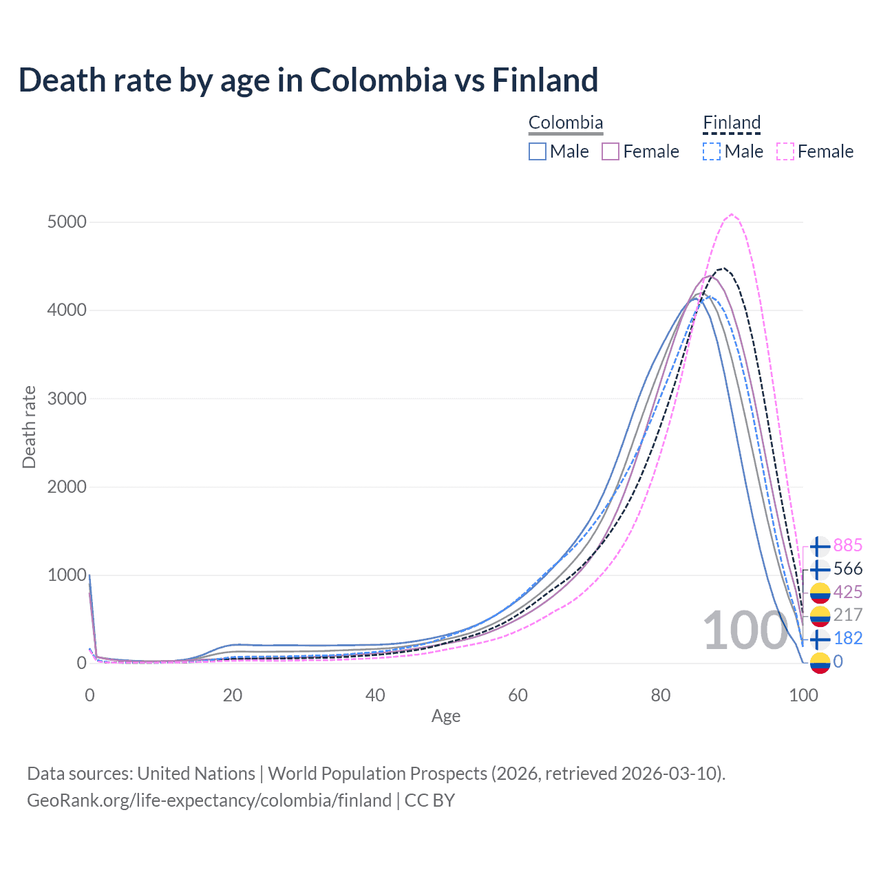 In Colombia, the most common age of death is 86, compared to 89 in Finland. The median age of death is 82.5 in Colombia and 85.6 in Finland, meaning only half of each cohort is expected to live past that age.