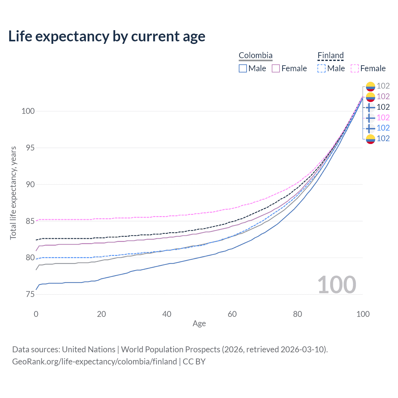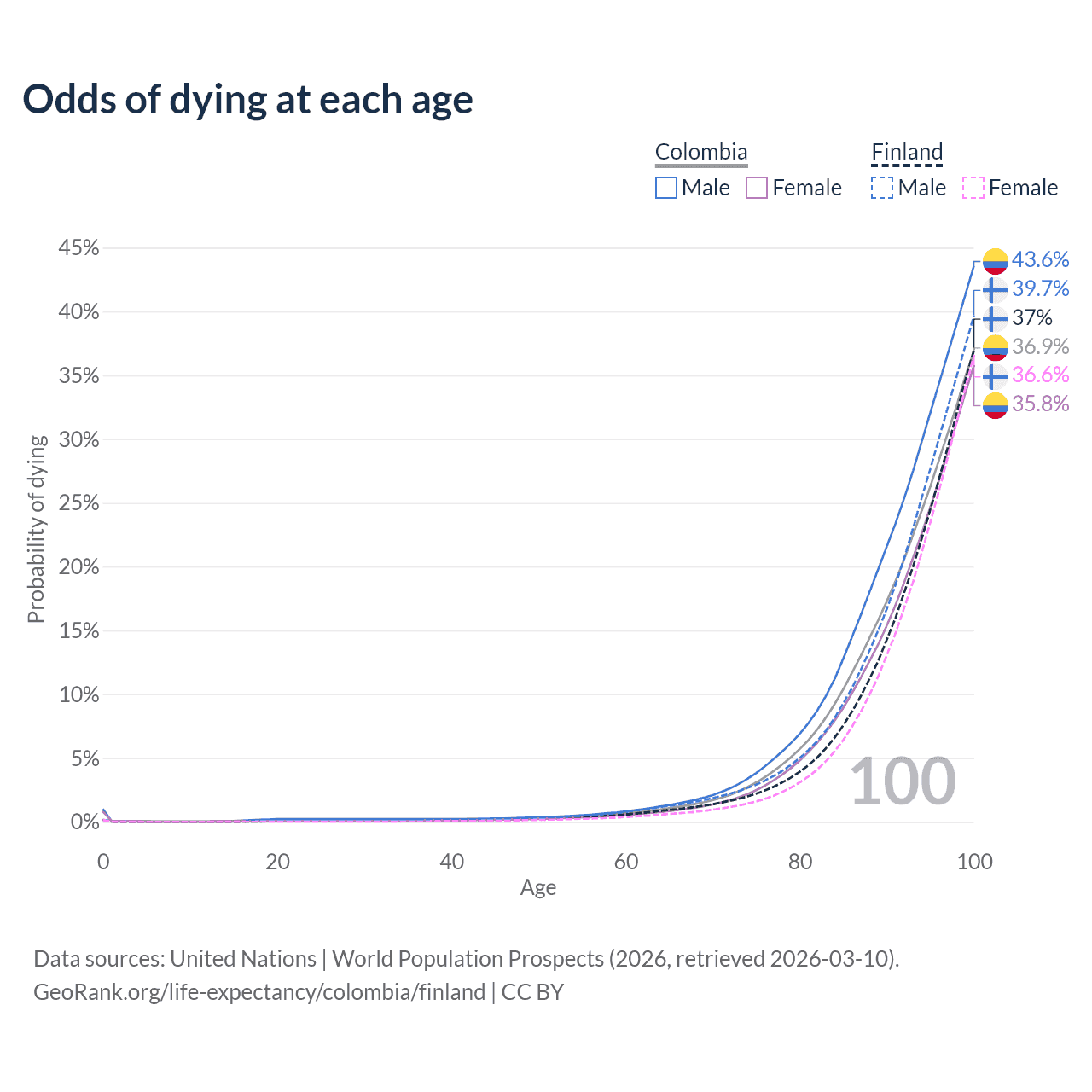 This life expectancy calculator shows the odds of living to 100, 95, 90, and below based on current age for both males and females in Colombia and Finland, along with mean and median age of death. The calculations are based on the 2026 life tables (actuarial tables) from the UN World Population Prospects.