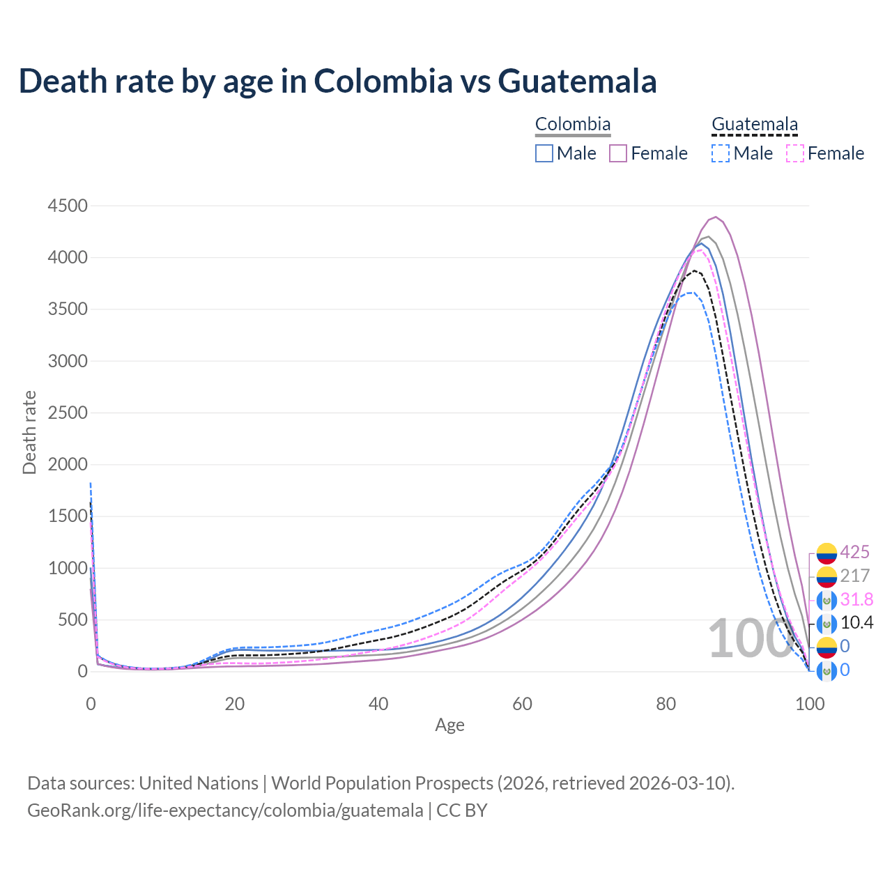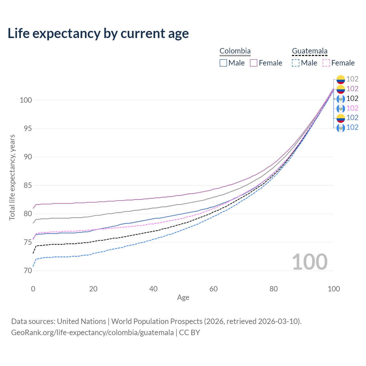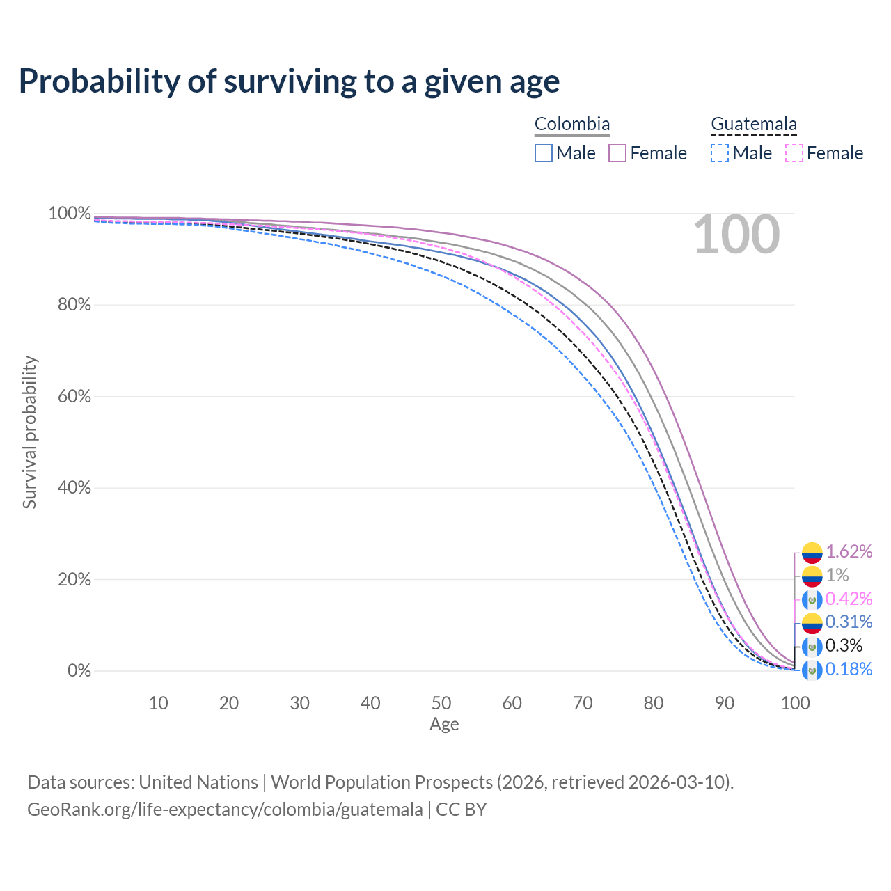 This life expectancy calculator shows the odds of living to 100, 95, 90, and below based on current age for both males and females in Colombia and Guatemala, along with mean and median age of death. The calculations are based on the 2026 life tables (actuarial tables) from the UN World Population Prospects.