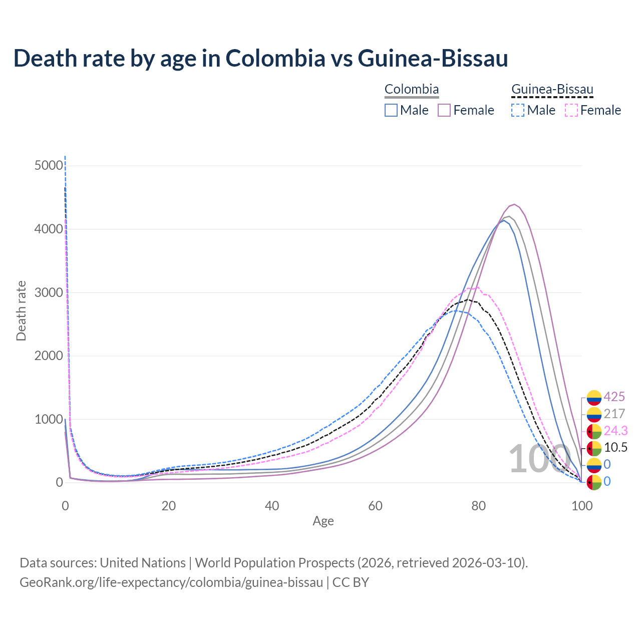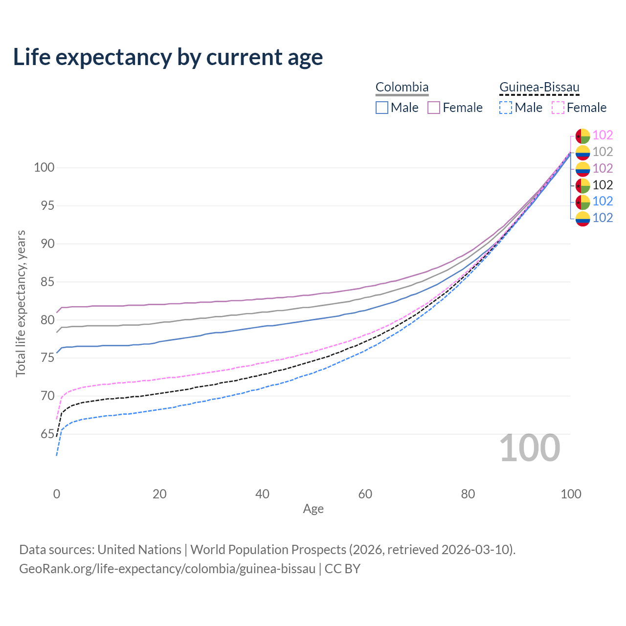 This life expectancy calculator shows the odds of living to 100, 95, 90, and below based on current age for both males and females in Colombia and Guinea-Bissau, along with mean and median age of death. The calculations are based on the 2026 life tables (actuarial tables) from the UN World Population Prospects.