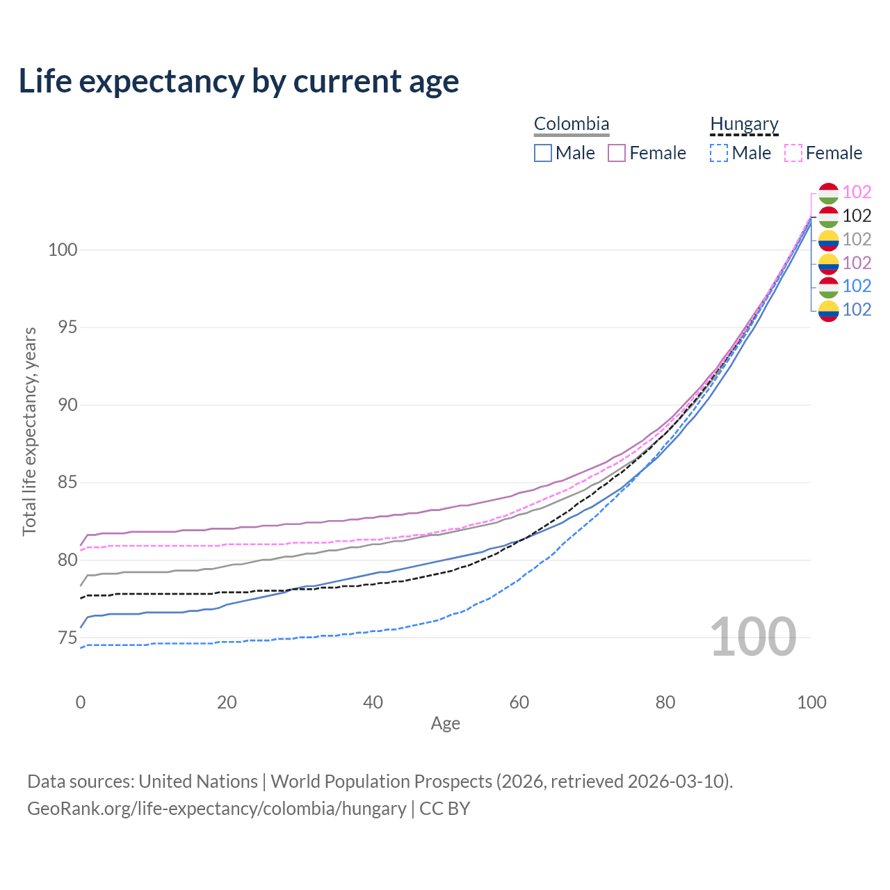 This life expectancy calculator shows the odds of living to 100, 95, 90, and below based on current age for both males and females in Colombia and Hungary, along with mean and median age of death. The calculations are based on the 2026 life tables (actuarial tables) from the UN World Population Prospects.