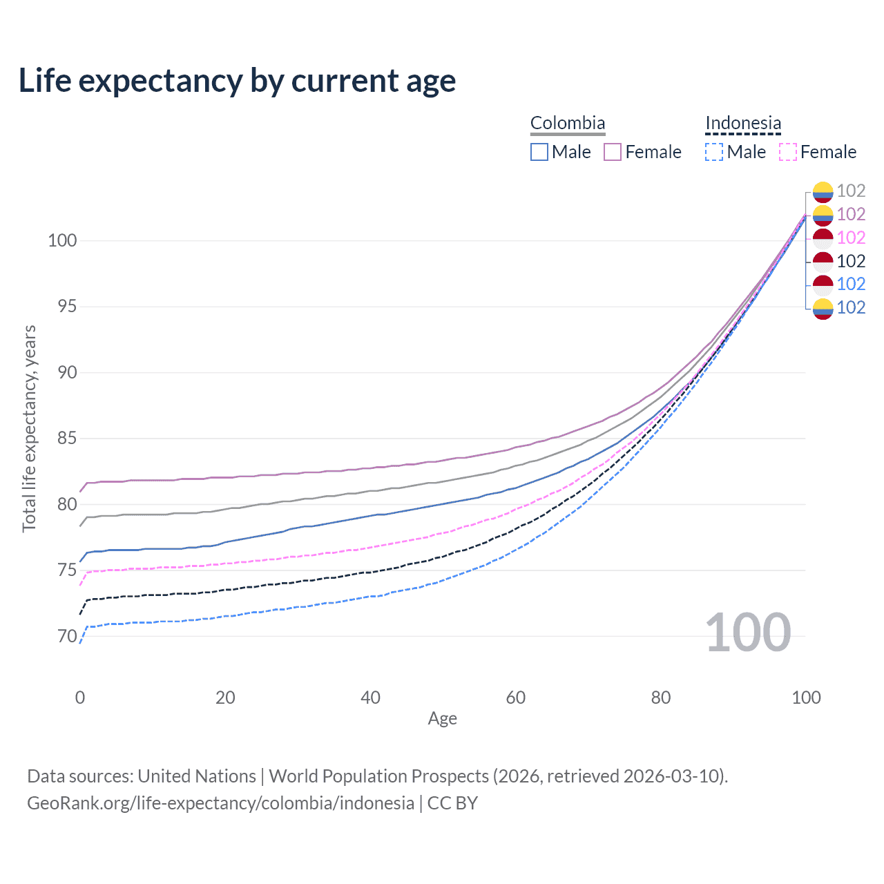 This life expectancy calculator shows the odds of living to 100, 95, 90, and below based on current age for both males and females in Colombia and Indonesia, along with mean and median age of death. The calculations are based on the 2026 life tables (actuarial tables) from the UN World Population Prospects.