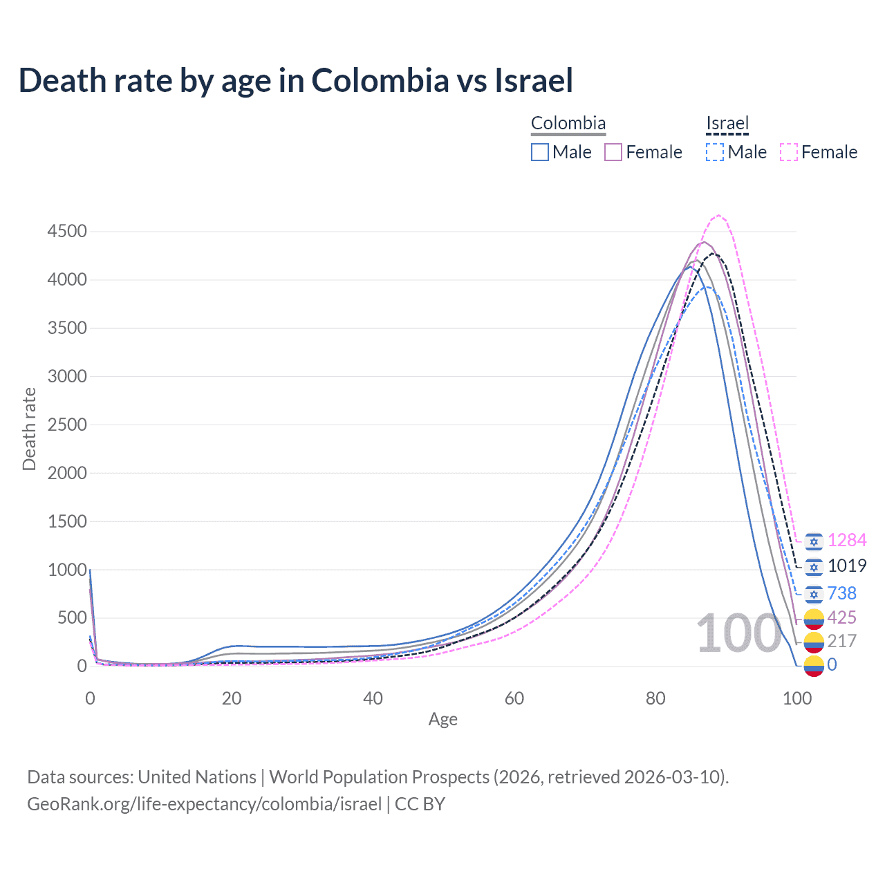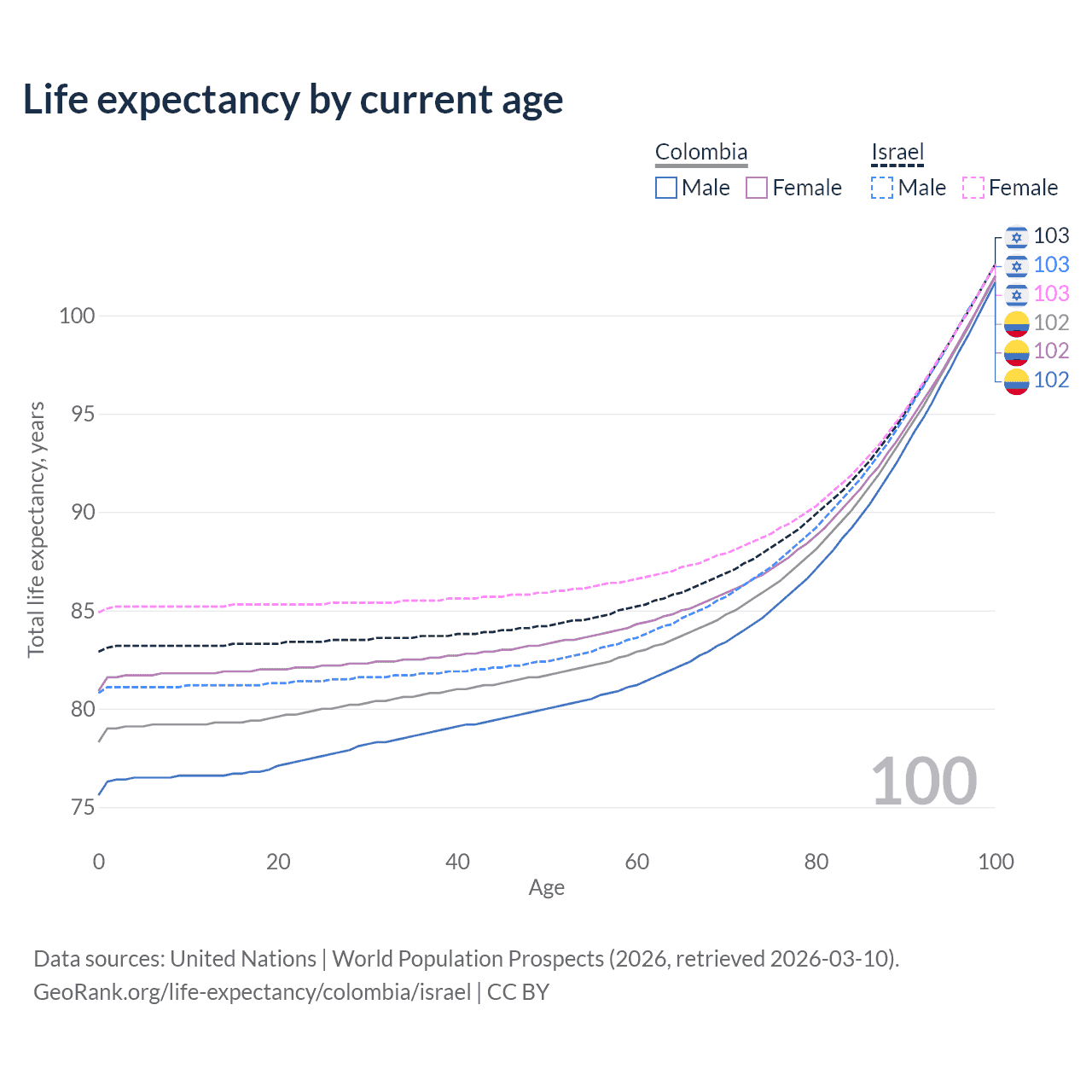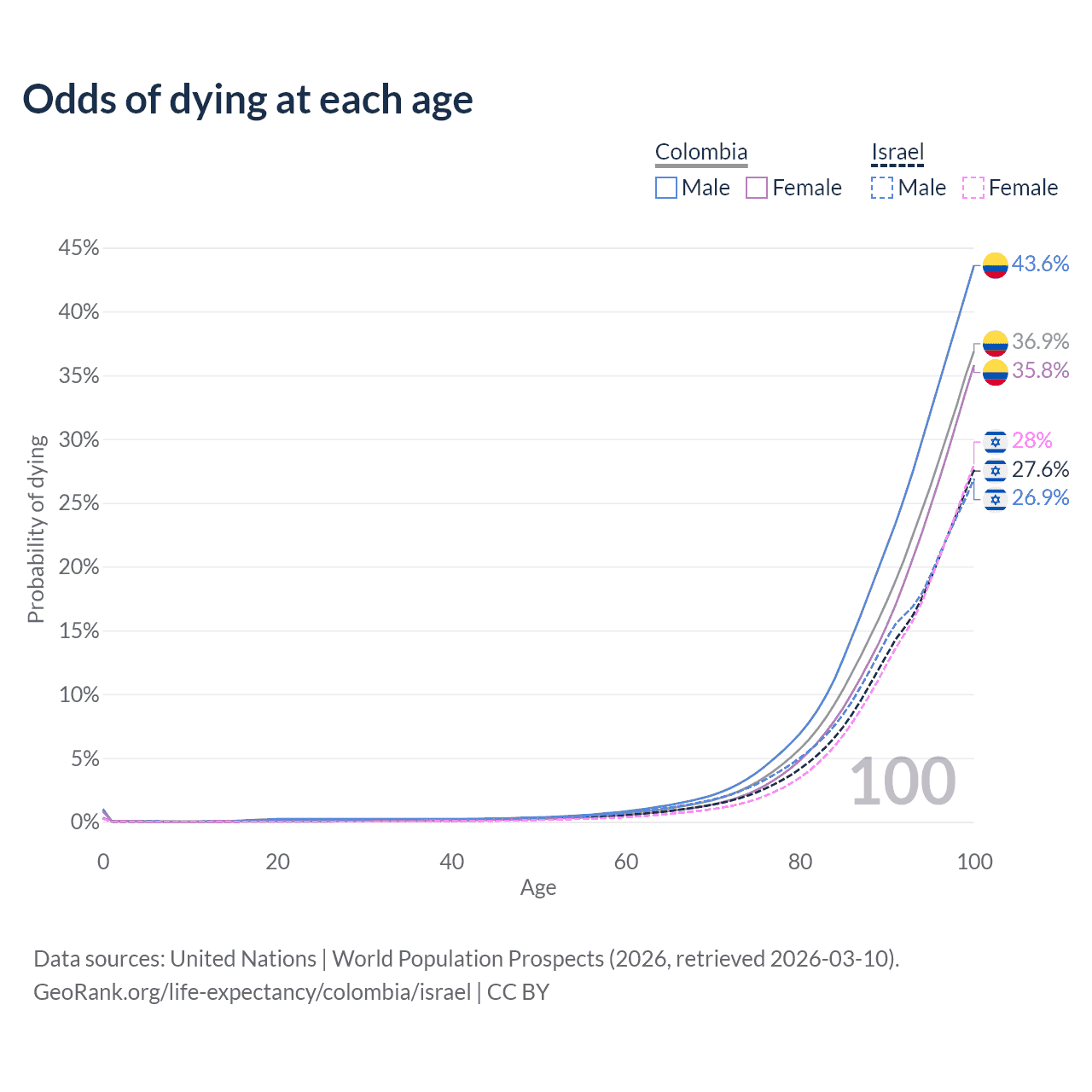 This life expectancy calculator shows the odds of living to 100, 95, 90, and below based on current age for both males and females in Colombia and Israel, along with mean and median age of death. The calculations are based on the 2026 life tables (actuarial tables) from the UN World Population Prospects.