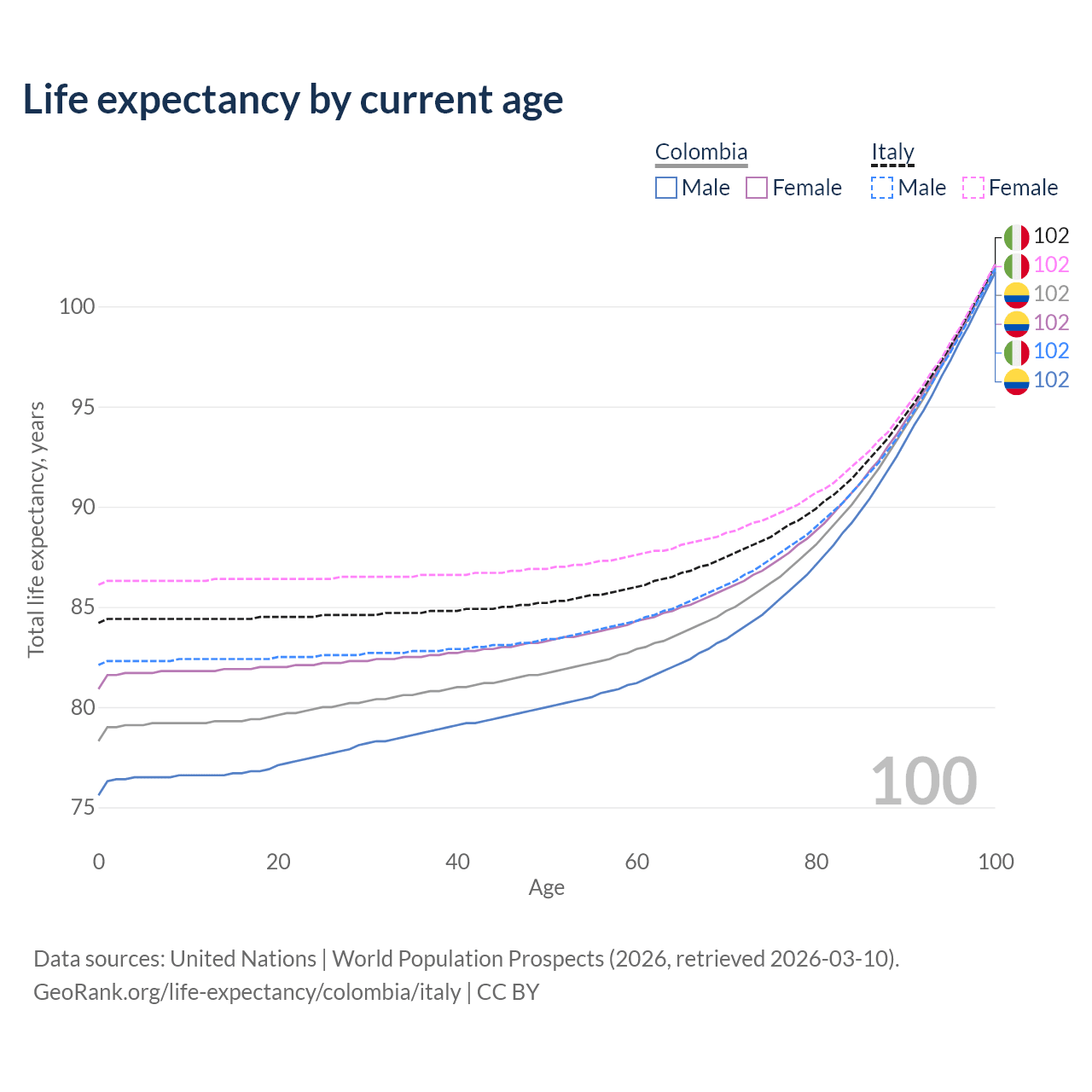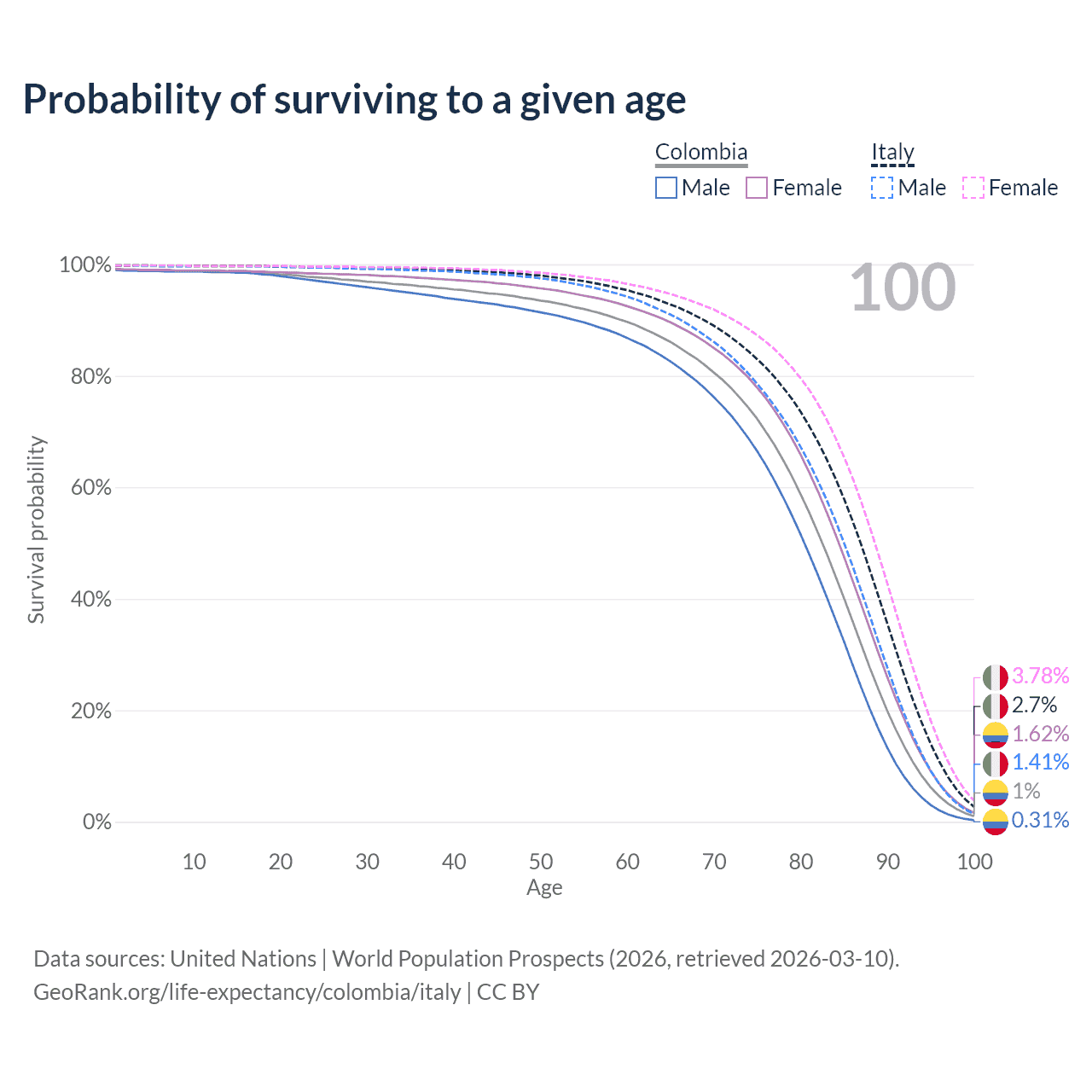 This life expectancy calculator shows the odds of living to 100, 95, 90, and below based on current age for both males and females in Colombia and Italy, along with mean and median age of death. The calculations are based on the 2026 life tables (actuarial tables) from the UN World Population Prospects.