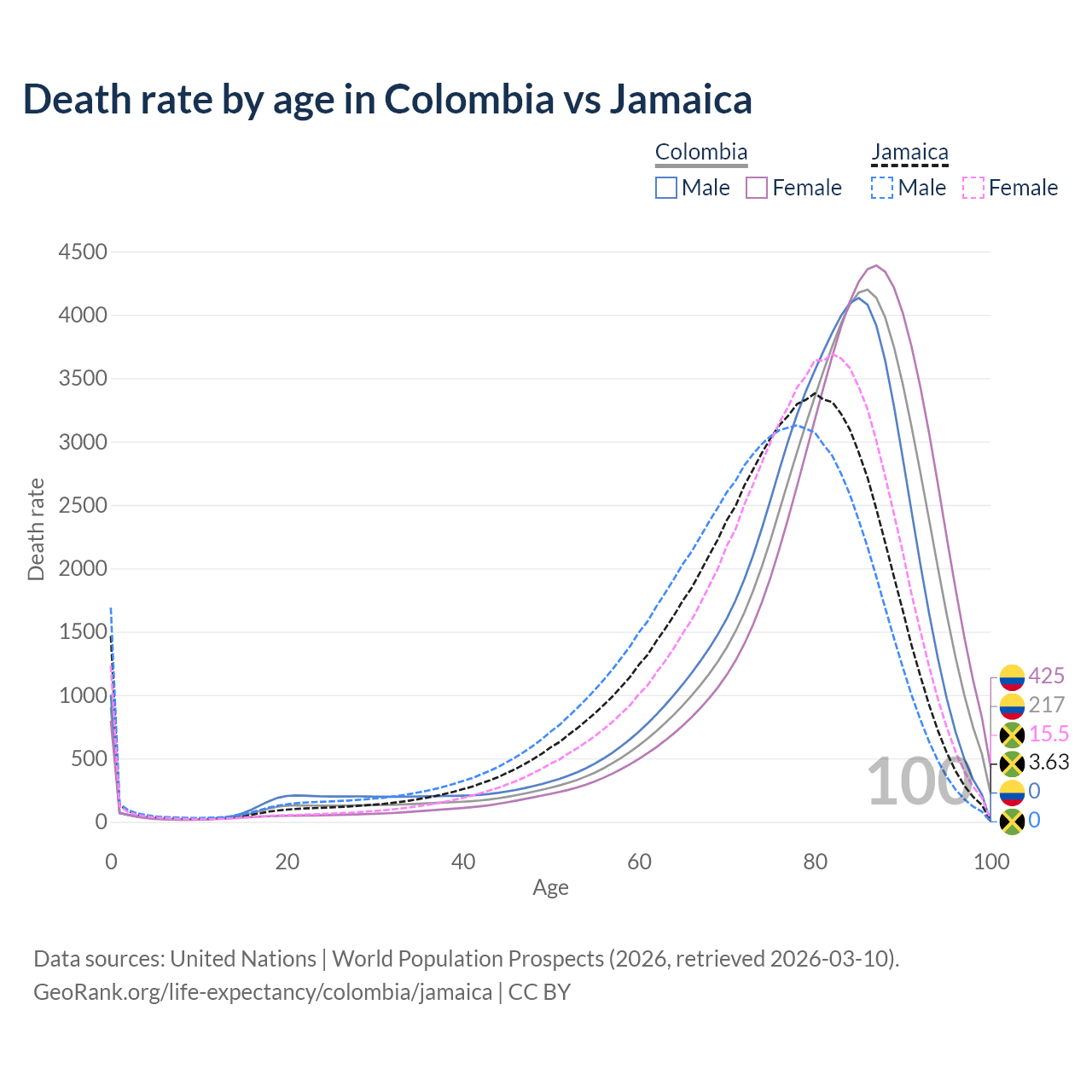In Colombia, the most common age of death is 86, compared to 80 in Jamaica. The median age of death is 82.5 in Colombia and 75.7 in Jamaica, meaning only half of each cohort is expected to live past that age.