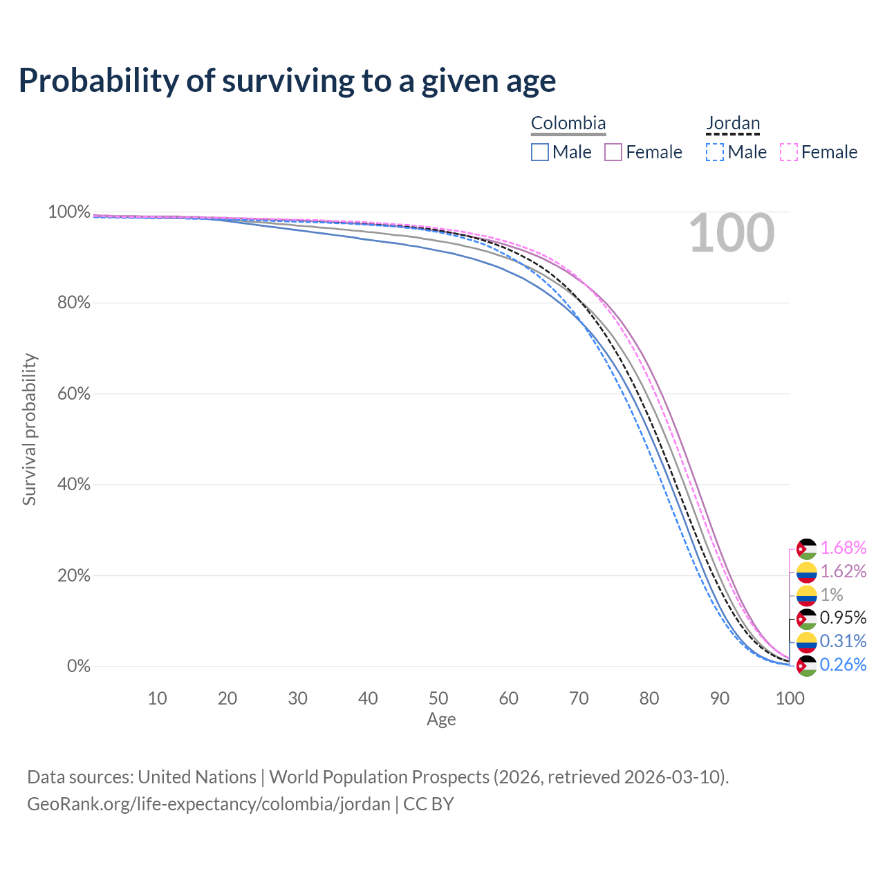 This life expectancy calculator shows the odds of living to 100, 95, 90, and below based on current age for both males and females in Colombia and Jordan, along with mean and median age of death. The calculations are based on the 2026 life tables (actuarial tables) from the UN World Population Prospects.
