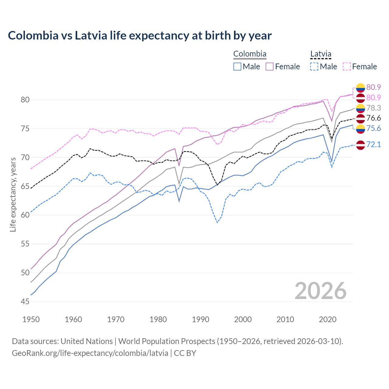 The average life expectancy at birth is 78.3 years in Colombia vs 76.6 in Latvia. Colombia is ranked 60/197 by life expectancy, and Latvia is 78/197. In Colombia, the life expectancy is 75.6 years for males and 80.9 years for females. In Latvia, it's 72.1 years for males and 80.9 years for females.