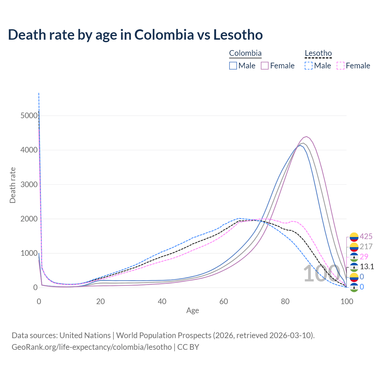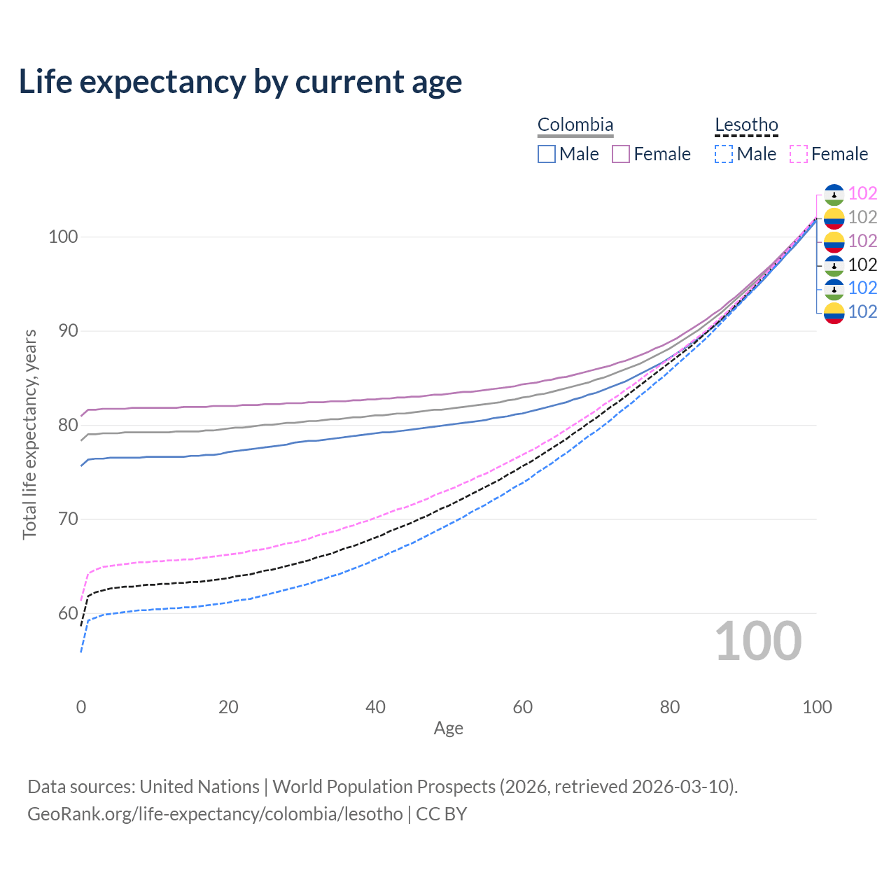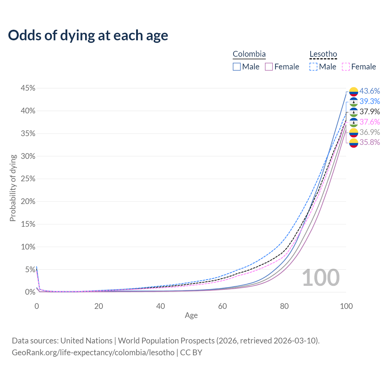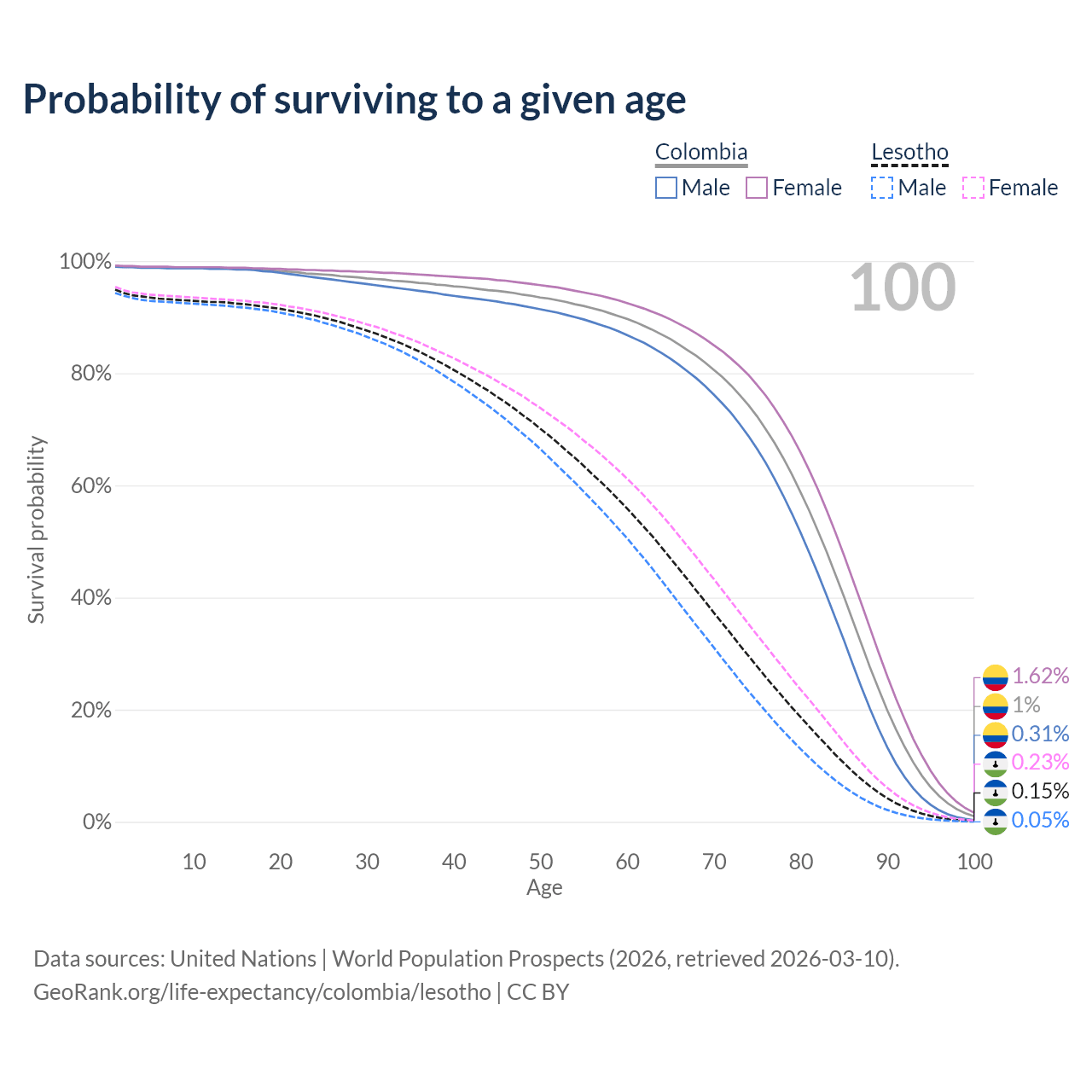 This life expectancy calculator shows the odds of living to 100, 95, 90, and below based on current age for both males and females in Colombia and Lesotho, along with mean and median age of death. The calculations are based on the 2026 life tables (actuarial tables) from the UN World Population Prospects.